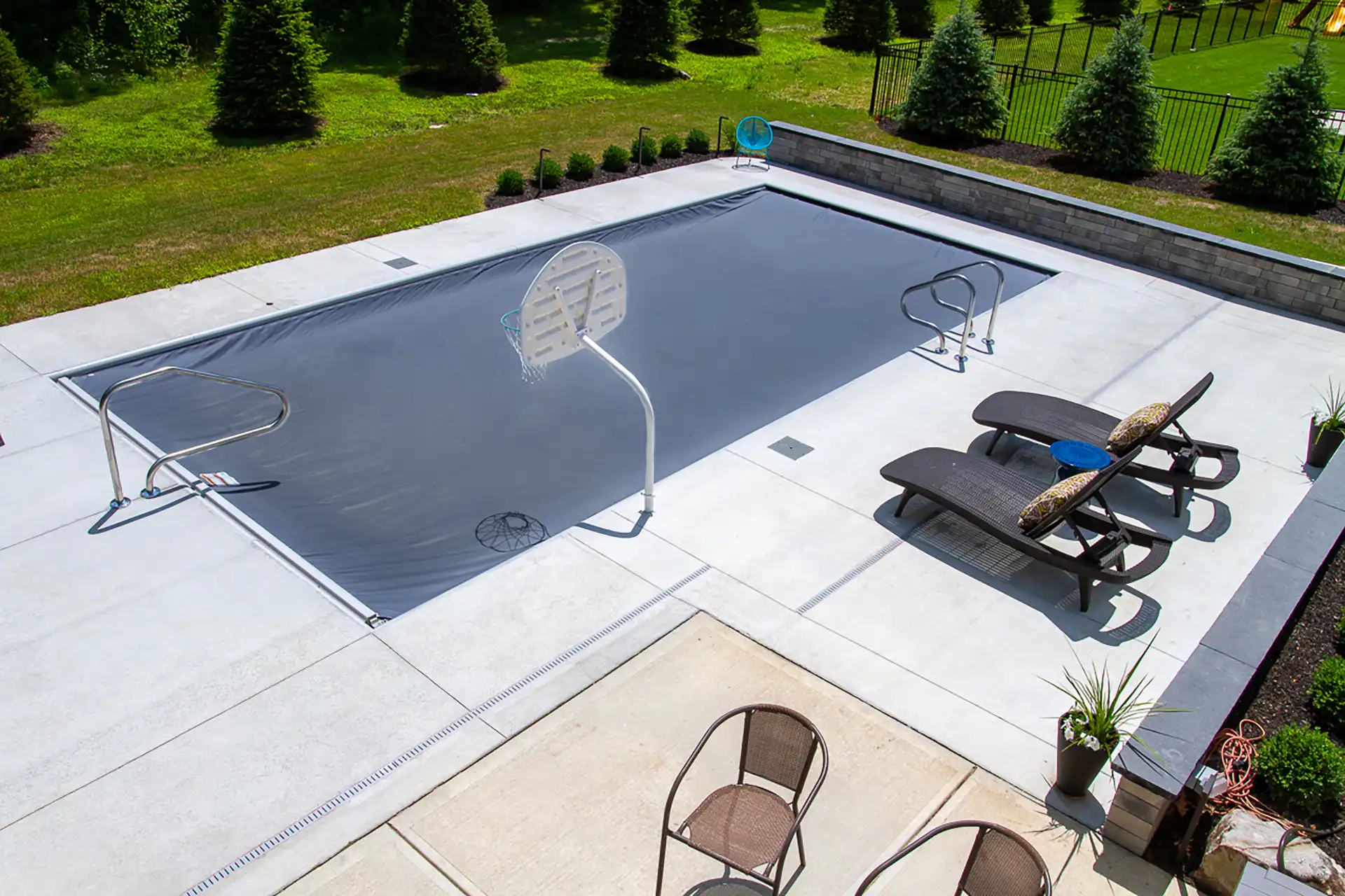 A safety cover is a durable, tension‑mounted fabric anchored to your pool deck, designed to prevent accidental falls and keep the pool secure when not in use. Safety covers are typically made from reinforced vinyl or mesh and are engineered to hold significant weight in case someone or something ventures onto them. They’re custom‑cut for a precise fit and anchored with springs and brackets around the pool perimeter, creating a taut barrier that covers the water without sagging or touching the surface.