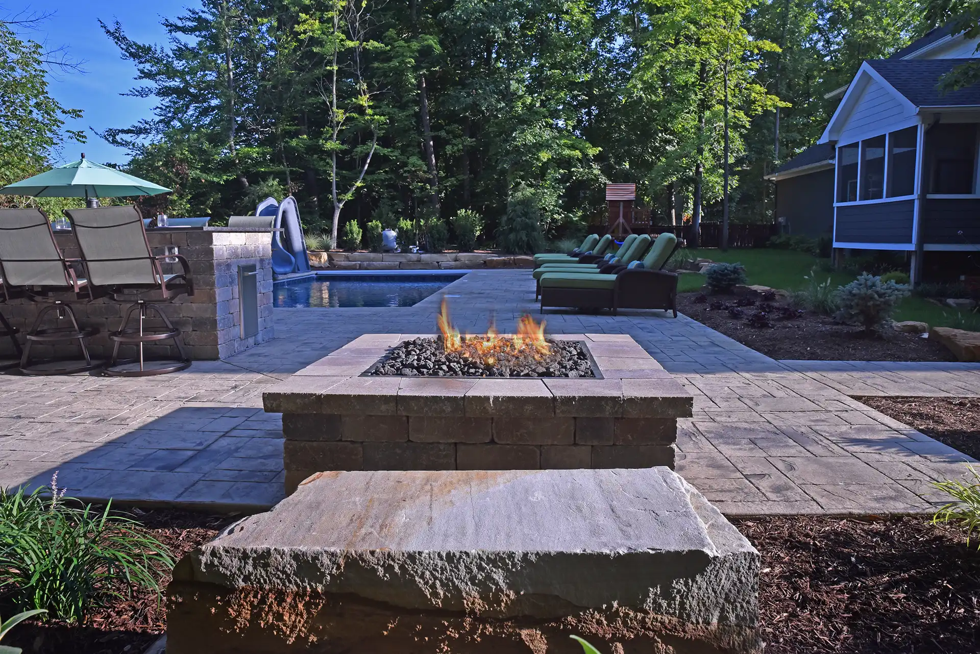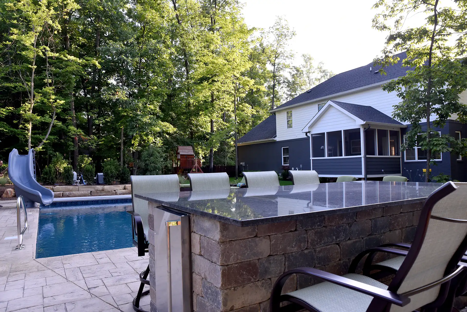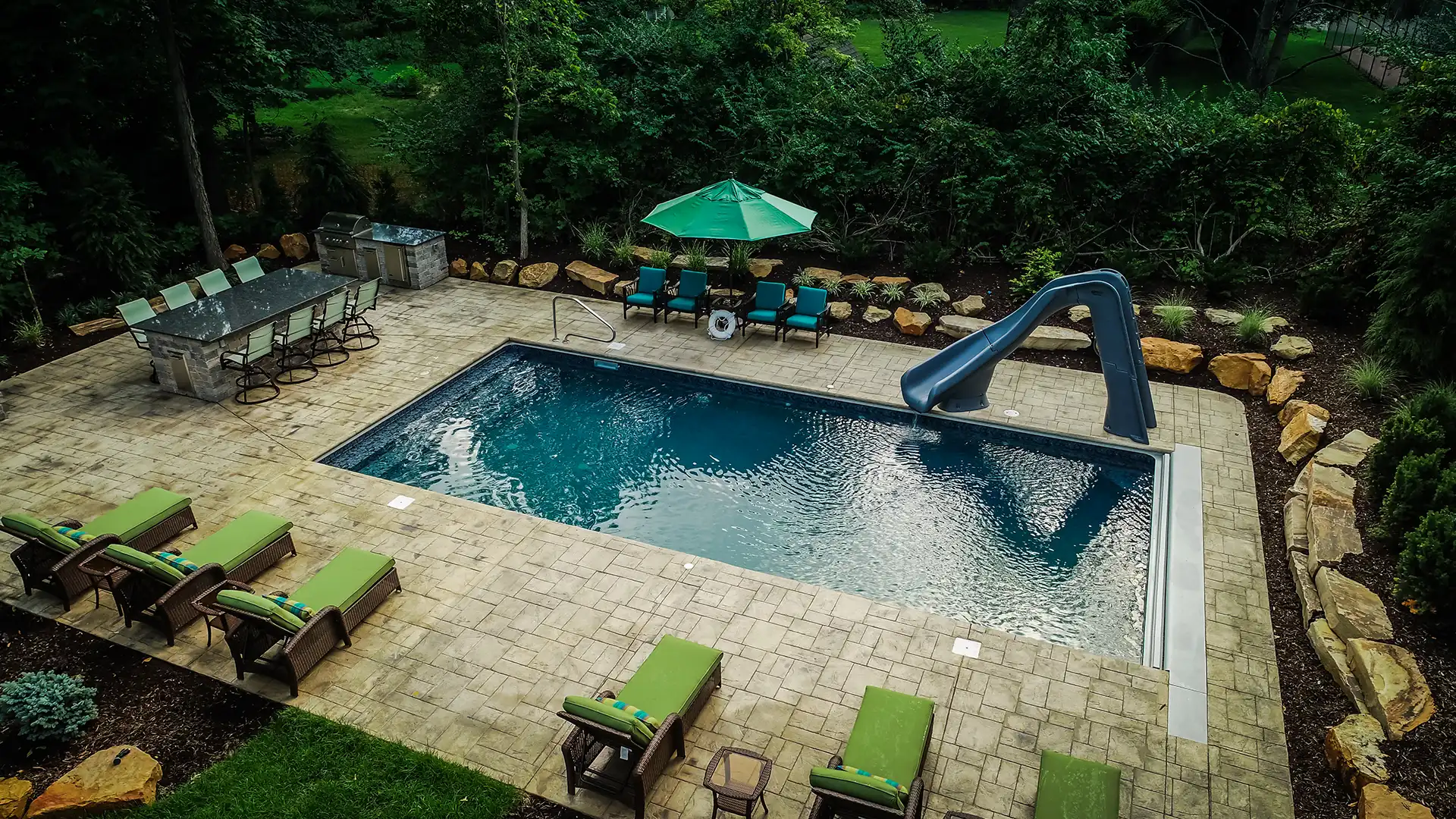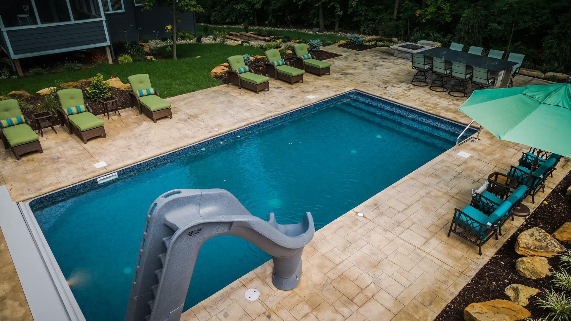Dynamic 16×36 vinyl pool with stamped concrete, pool slide, undermount cover, and grill island.