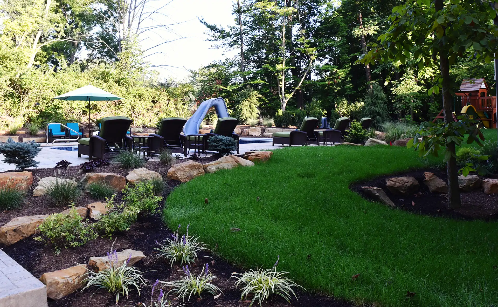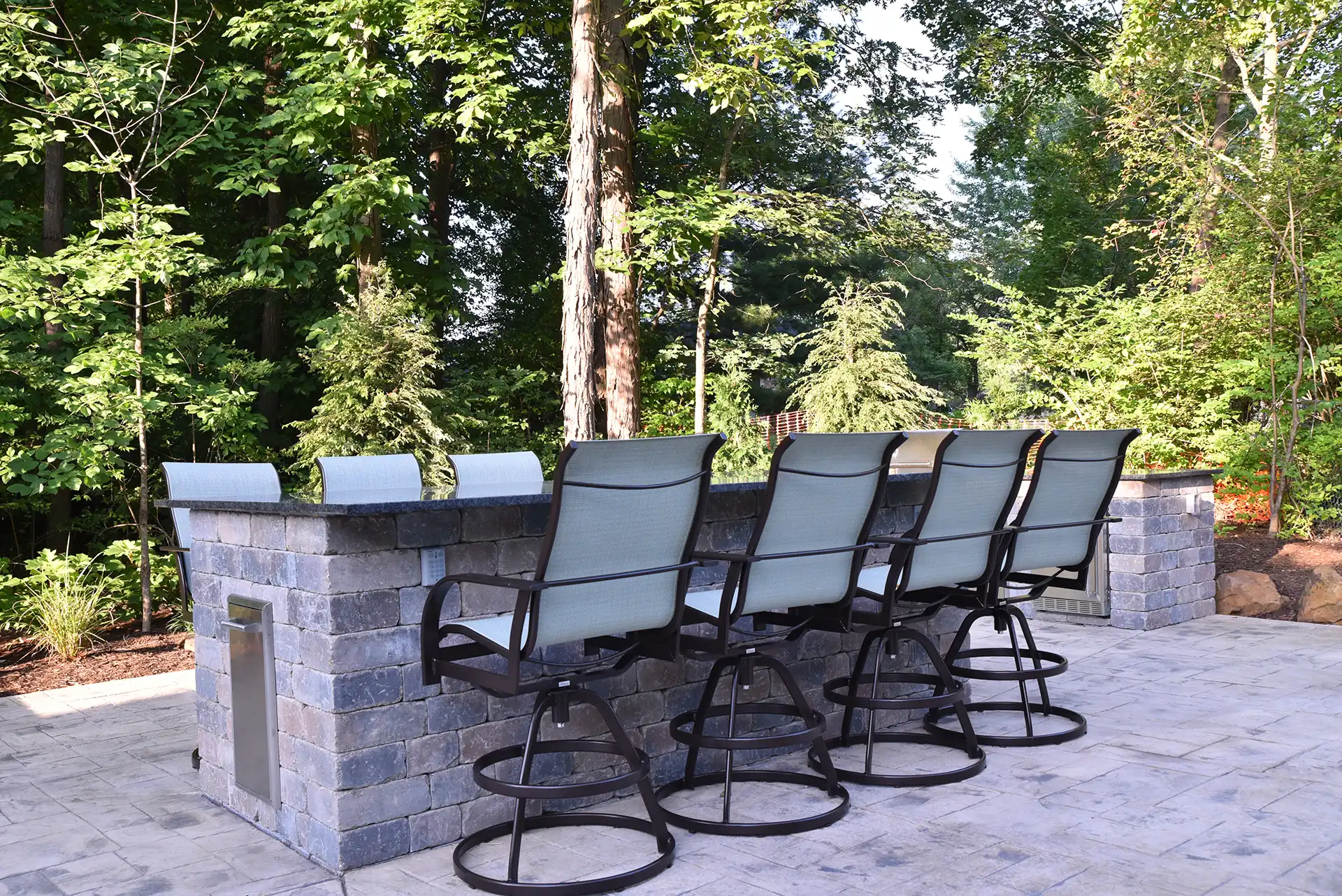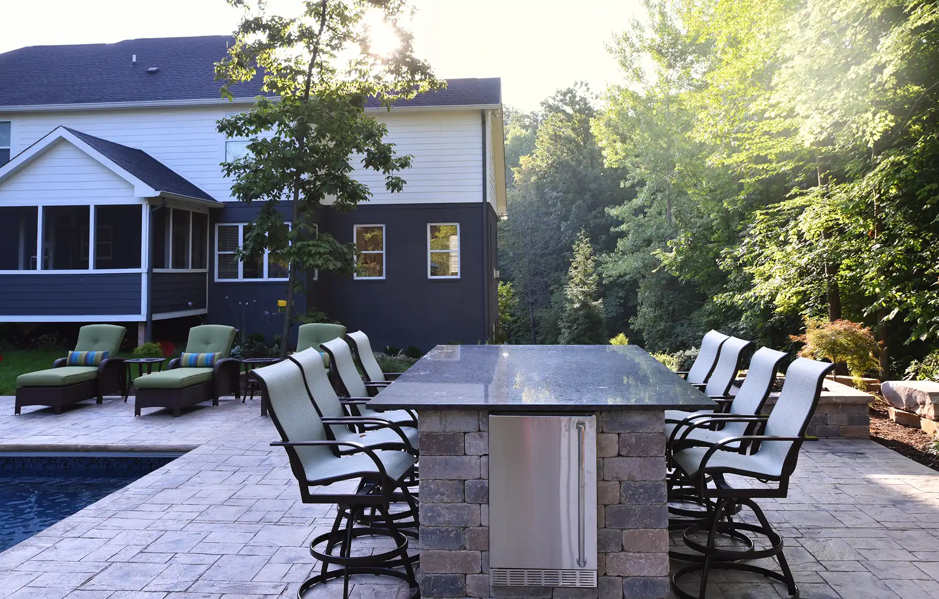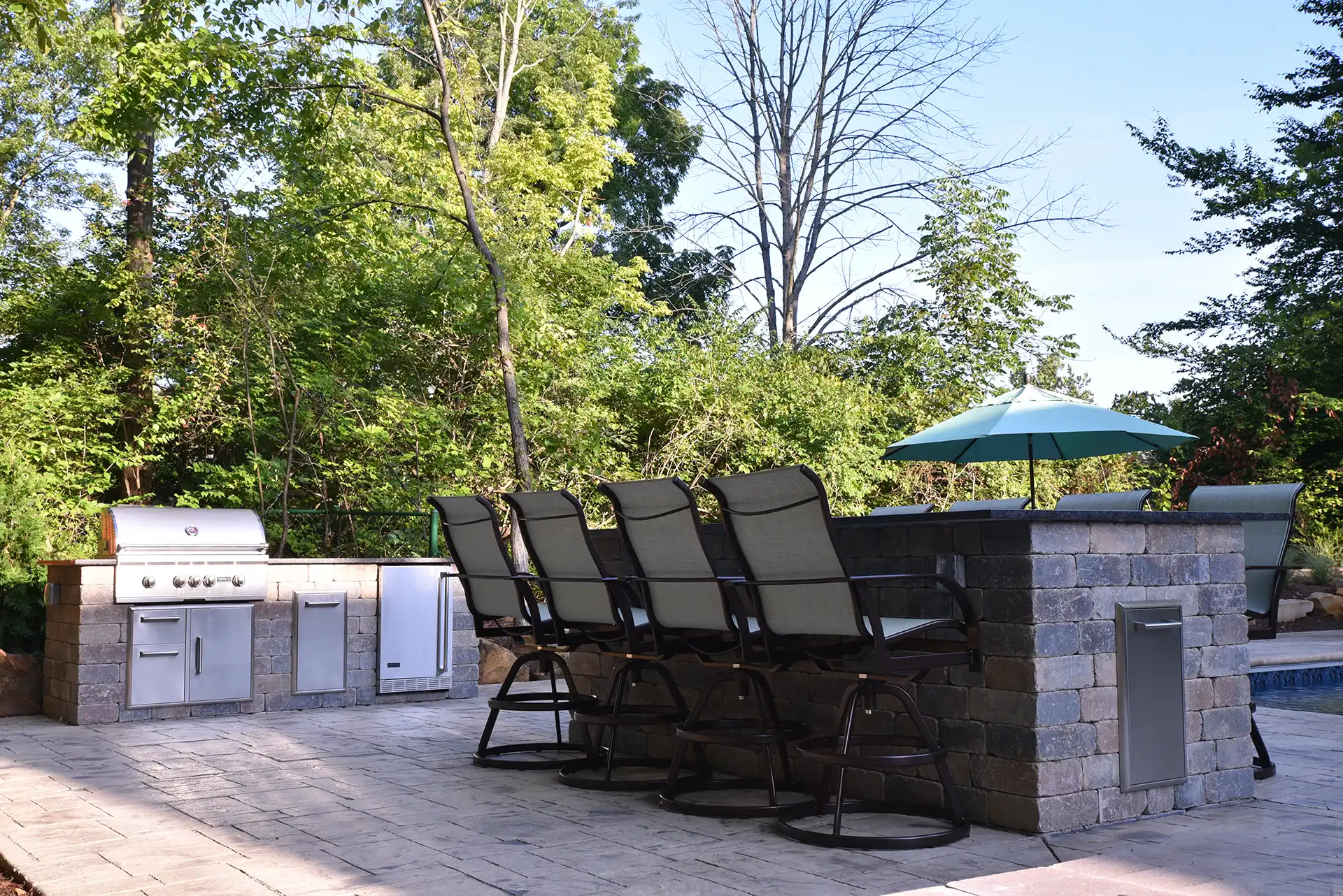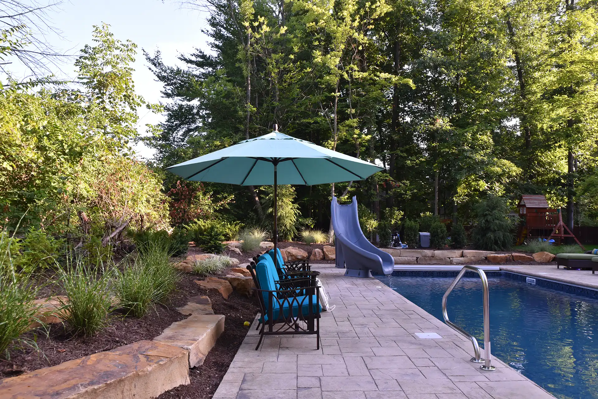 Dynamic 16×36 vinyl pool with stamped concrete, pool slide, undermount cover, and grill island.