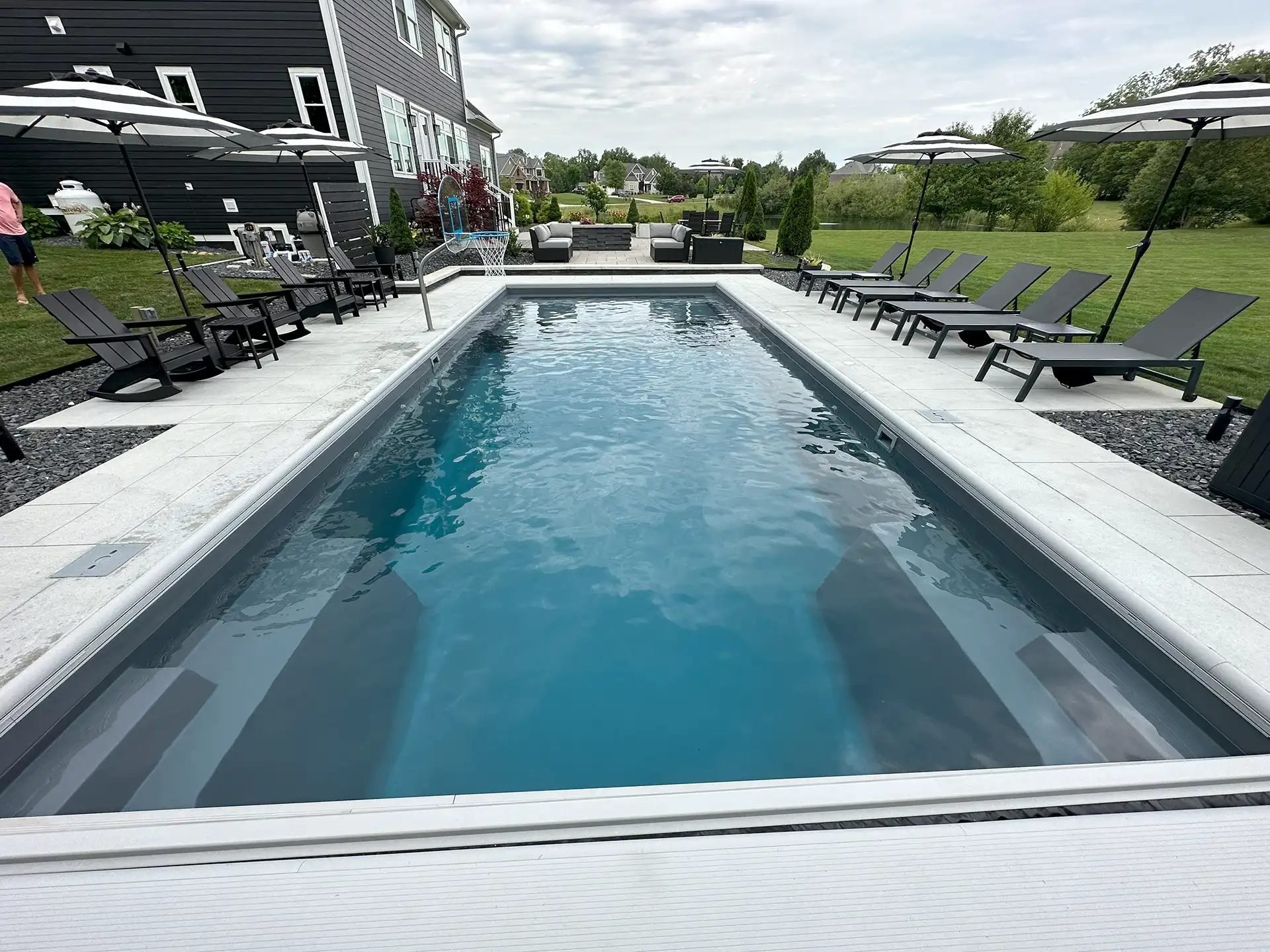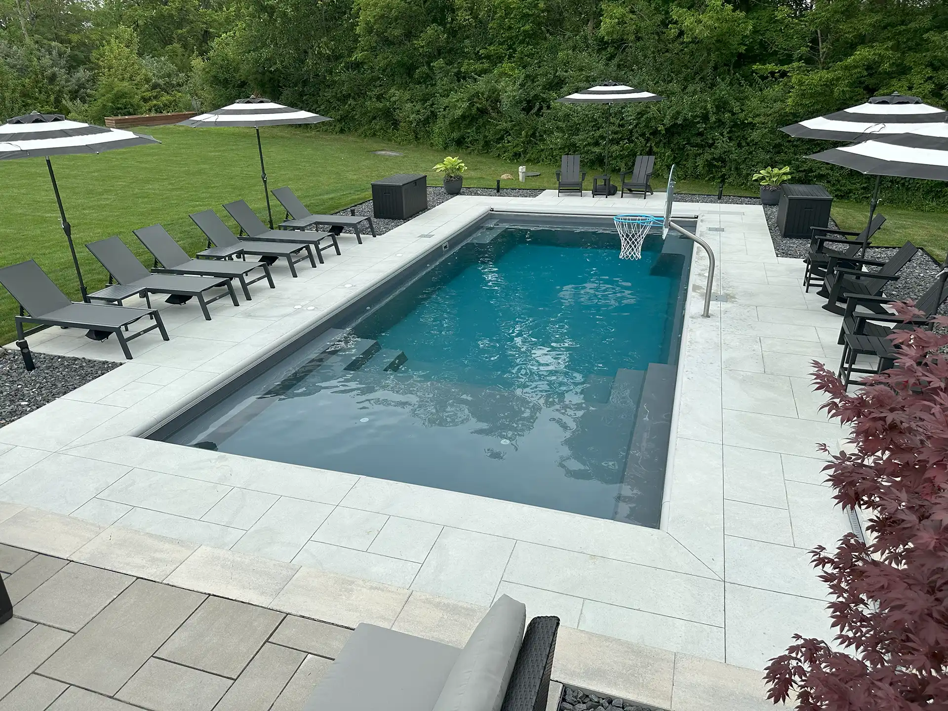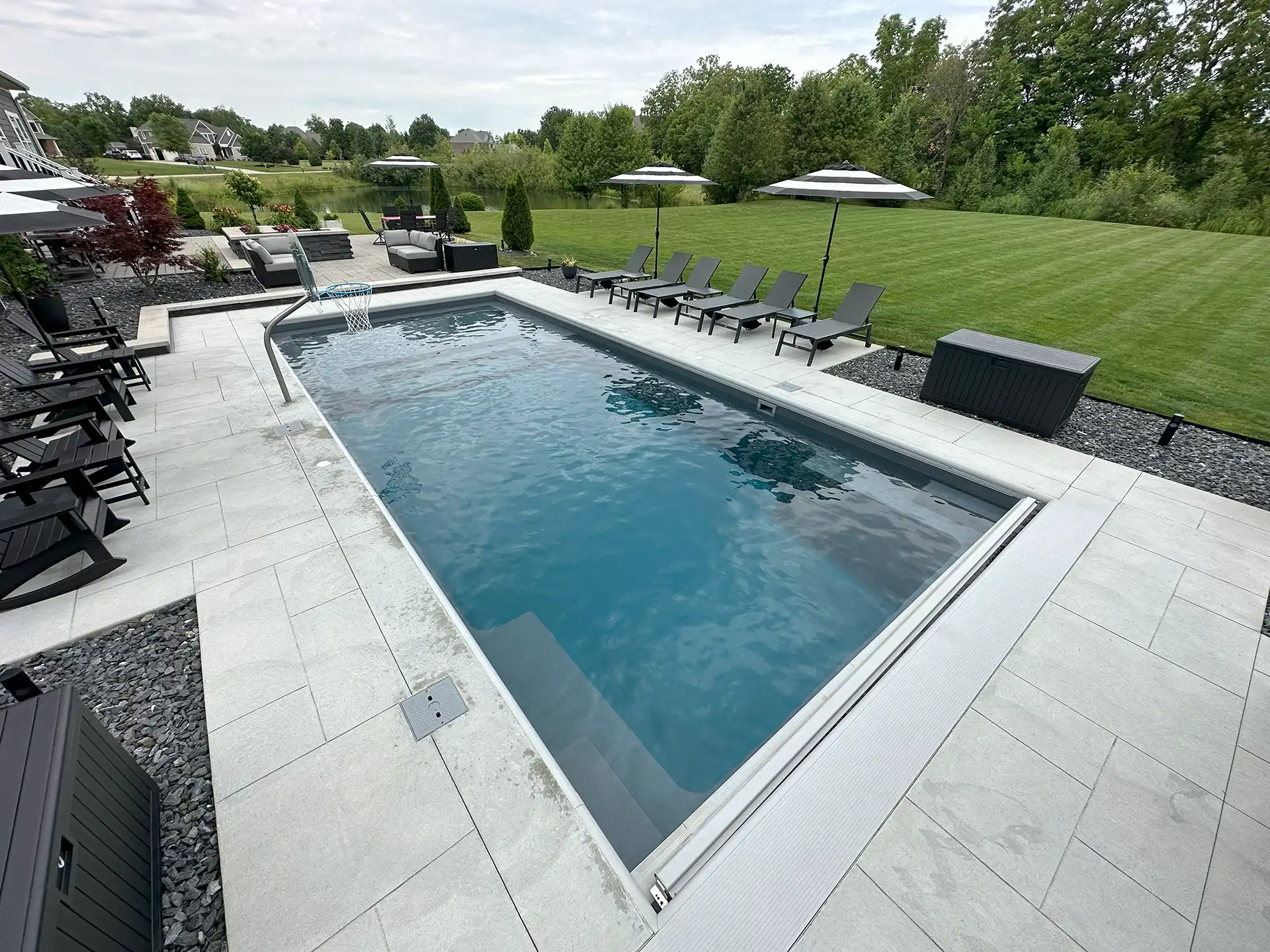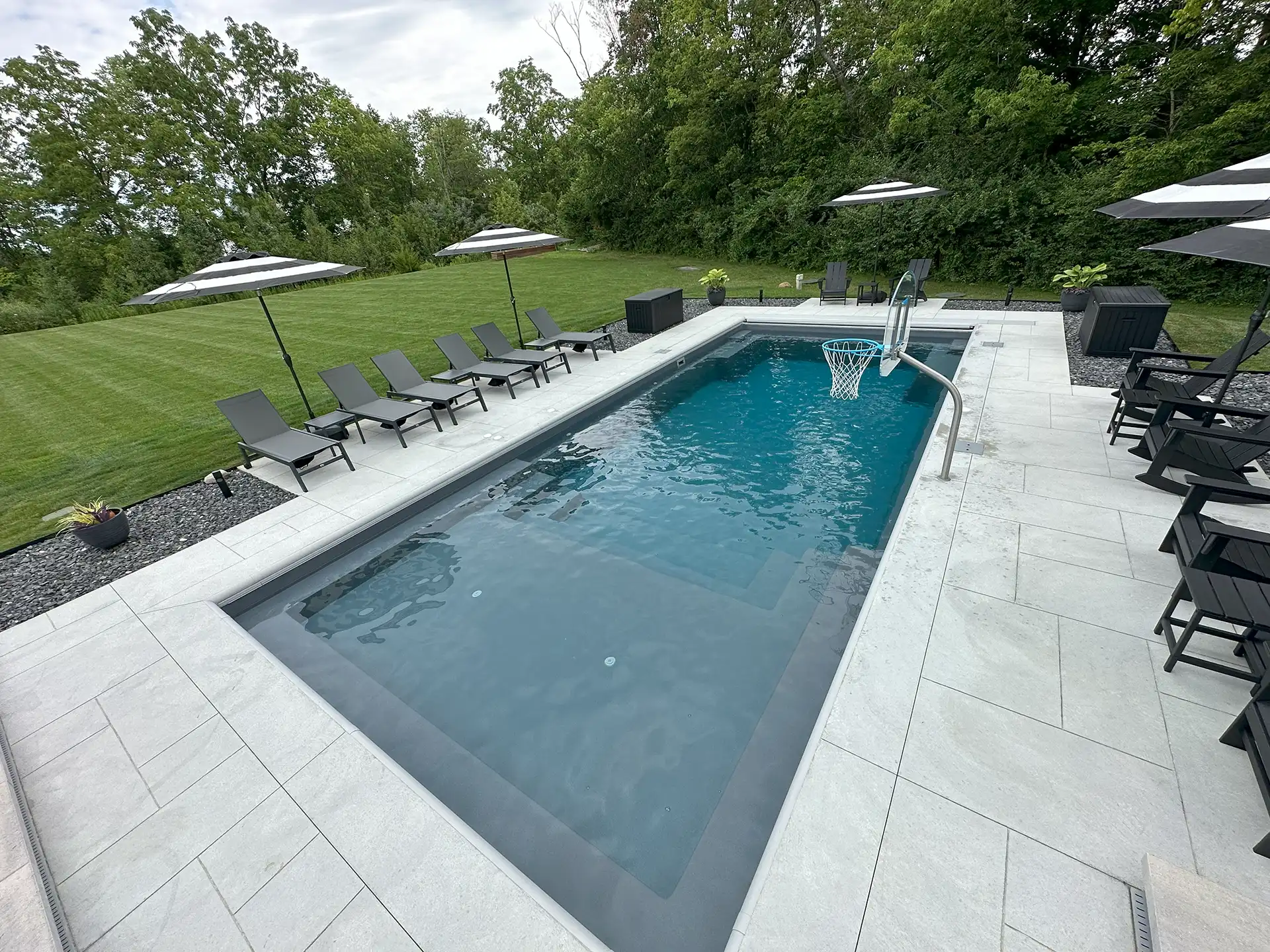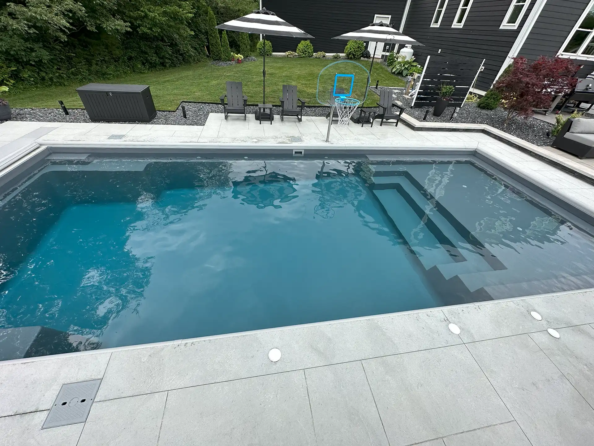 Modern 16×35 fiberglass pool offering bubblers, undermount cover, storm grey color, and basketball hoop.
