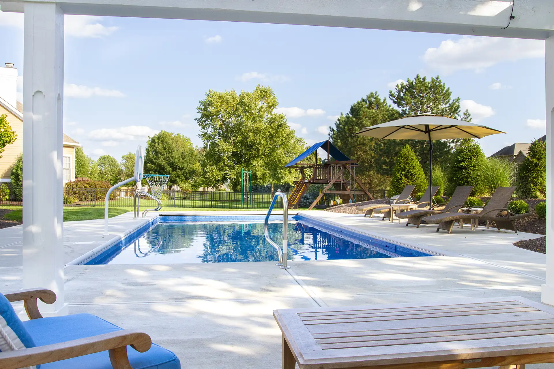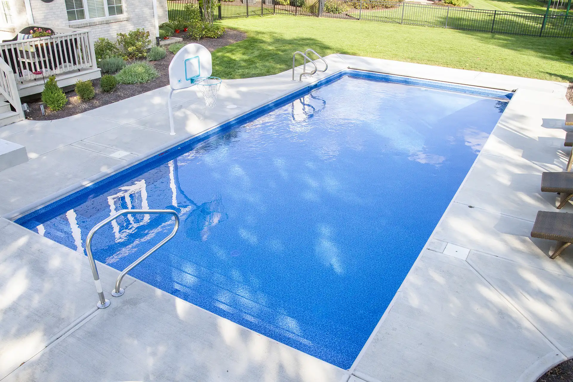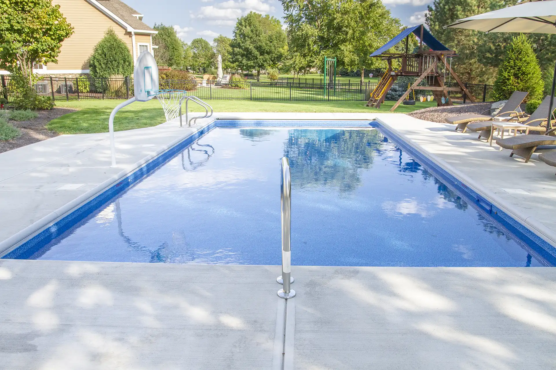 Inviting 16×32 vinyl pool featuring full steps, basketball hoop, in-wall ladder, and pergola.