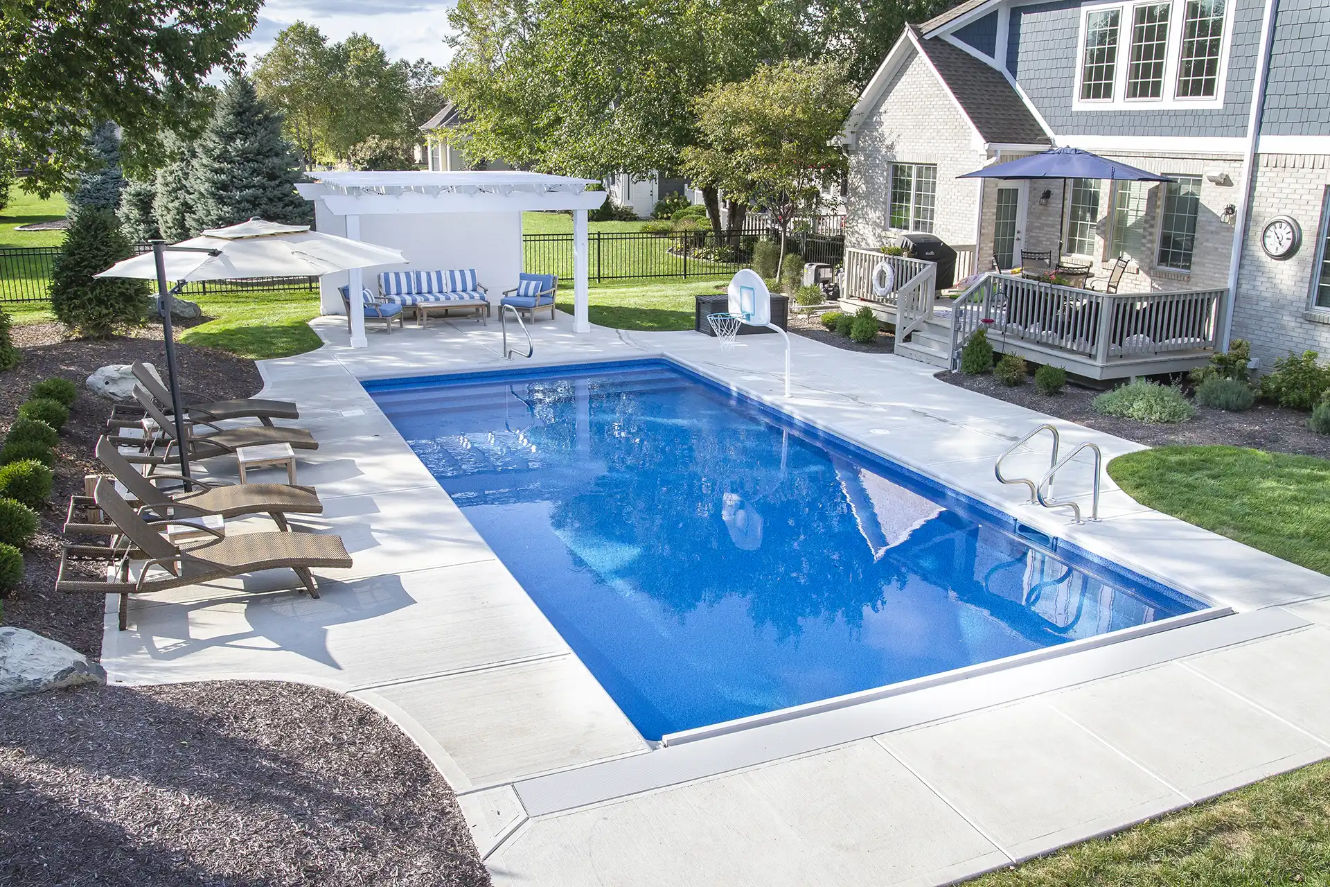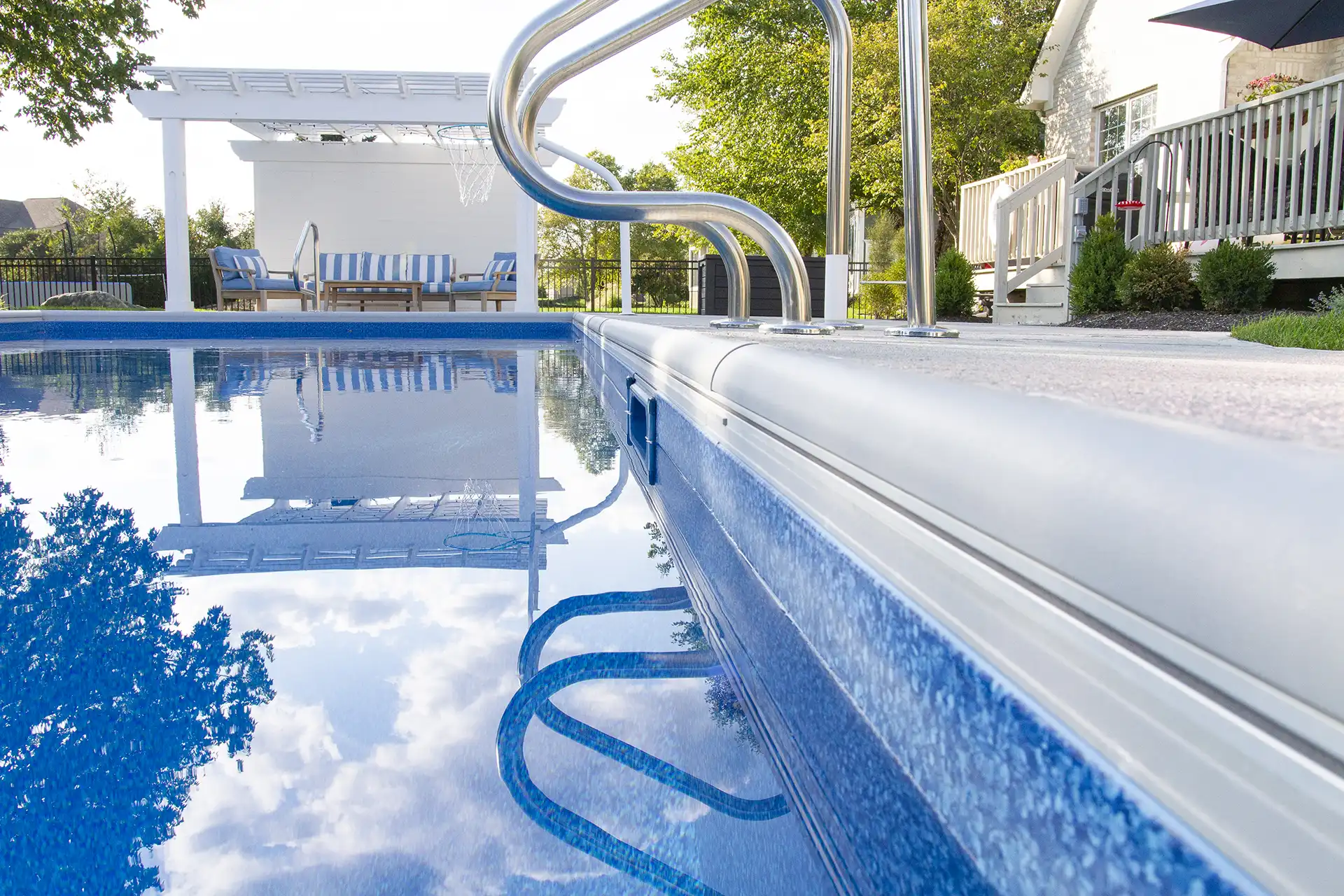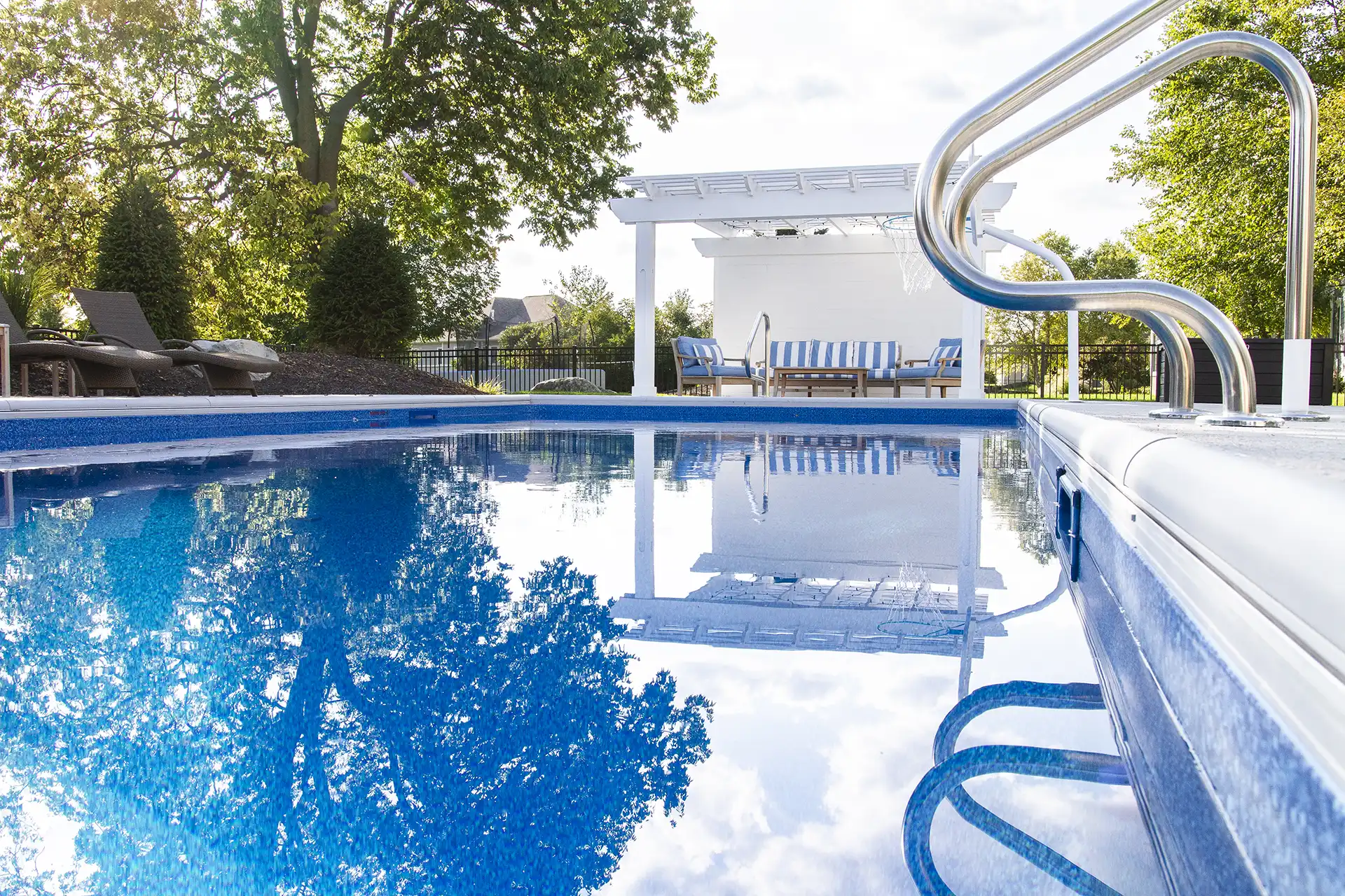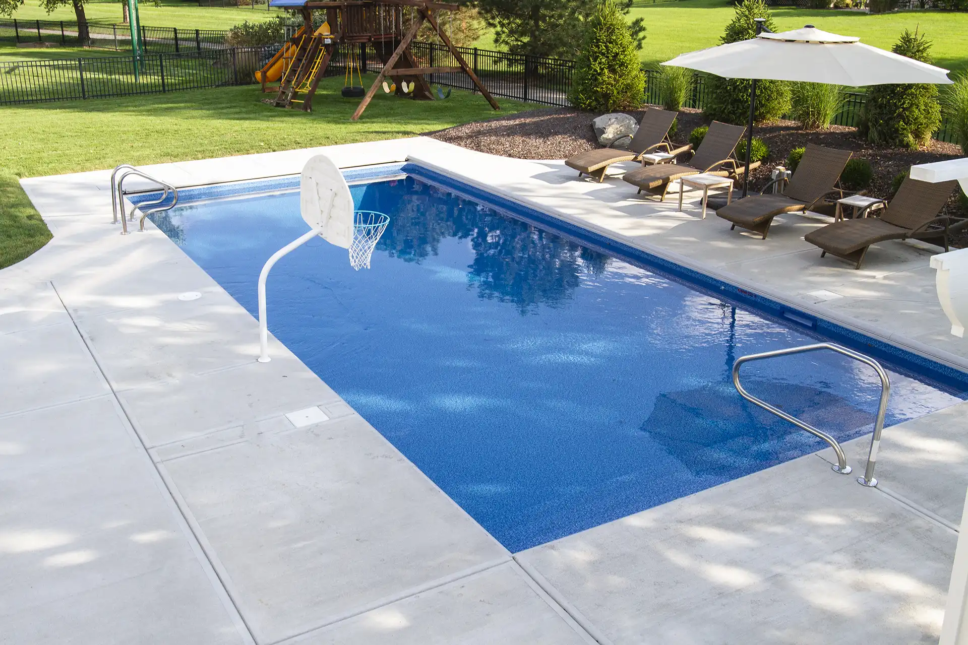 Inviting 16×32 vinyl pool featuring full steps, basketball hoop, in-wall ladder, and pergola.