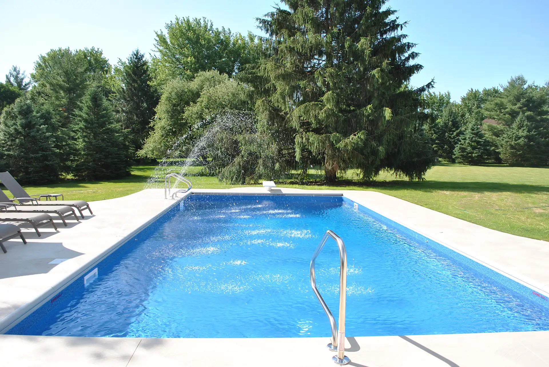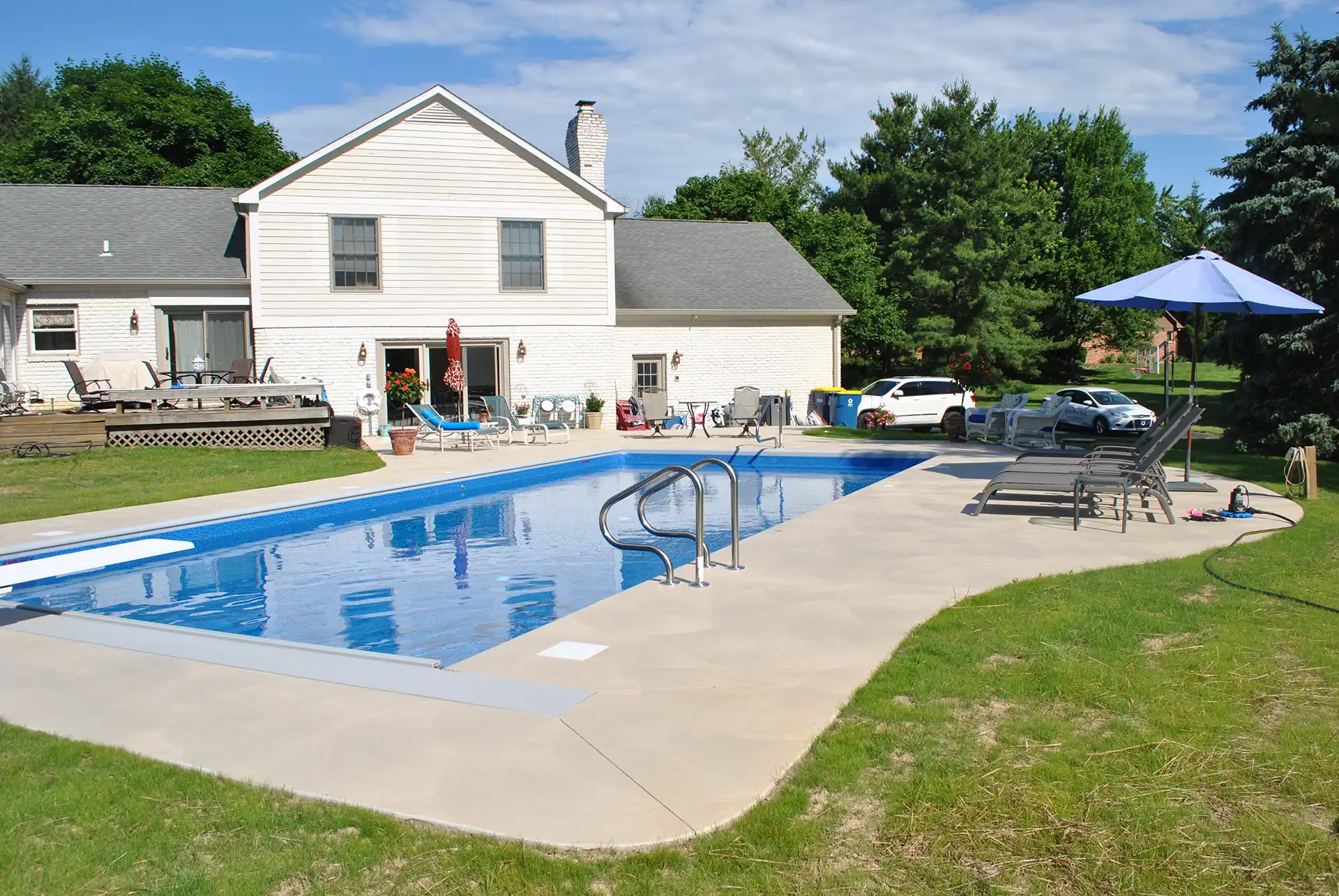 Balanced 18×36 vinyl pool featuring full steps, diving board, colored concrete, and deck jets.
