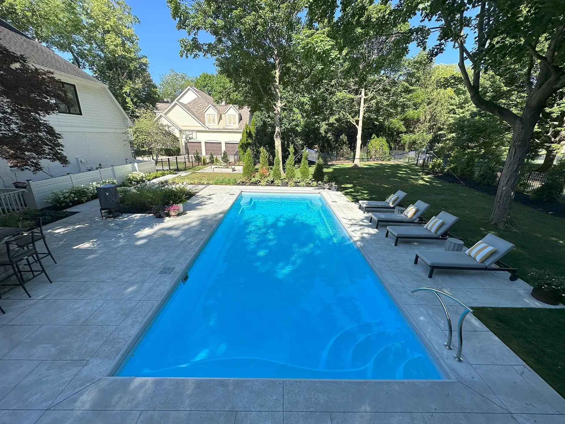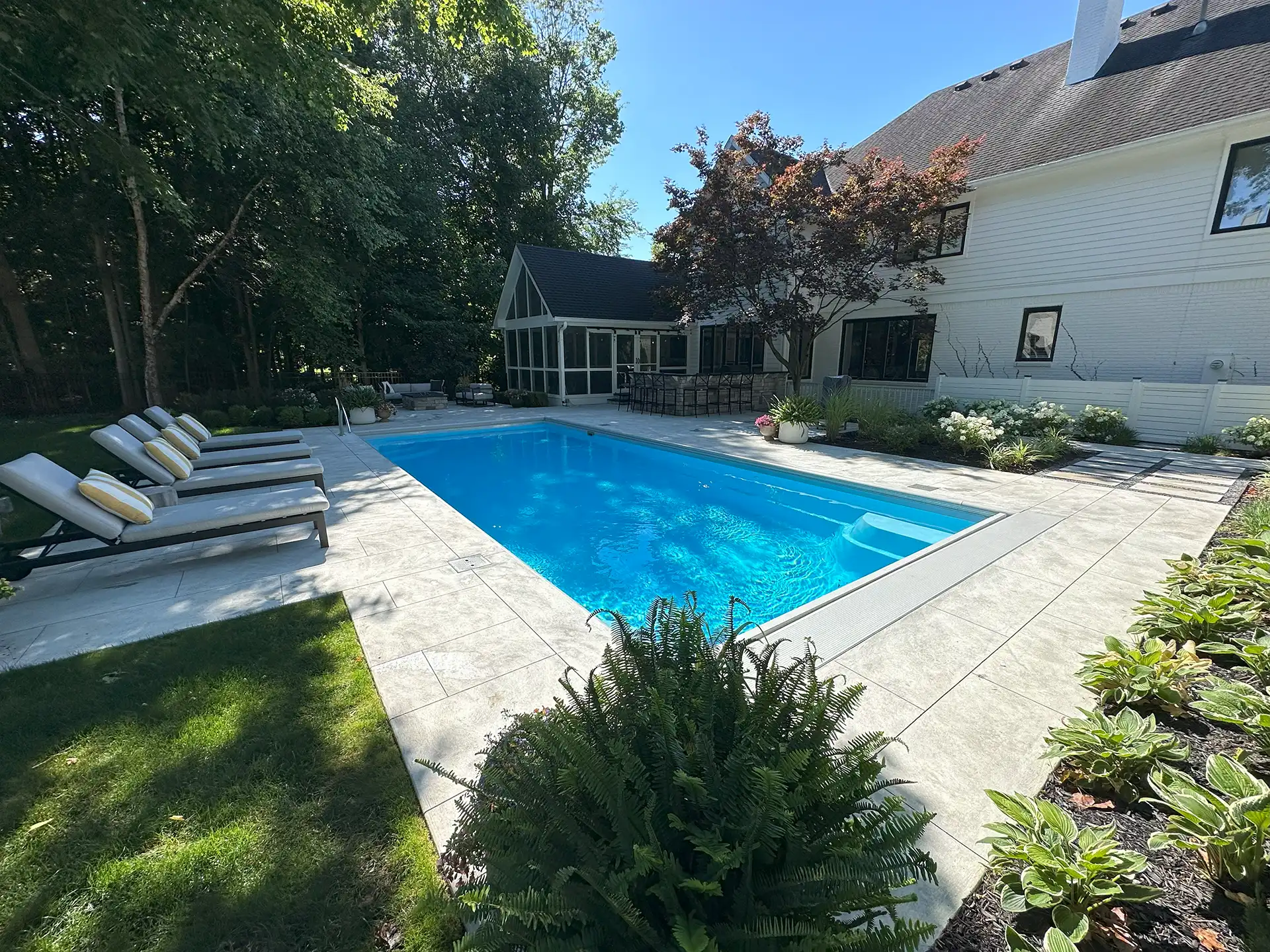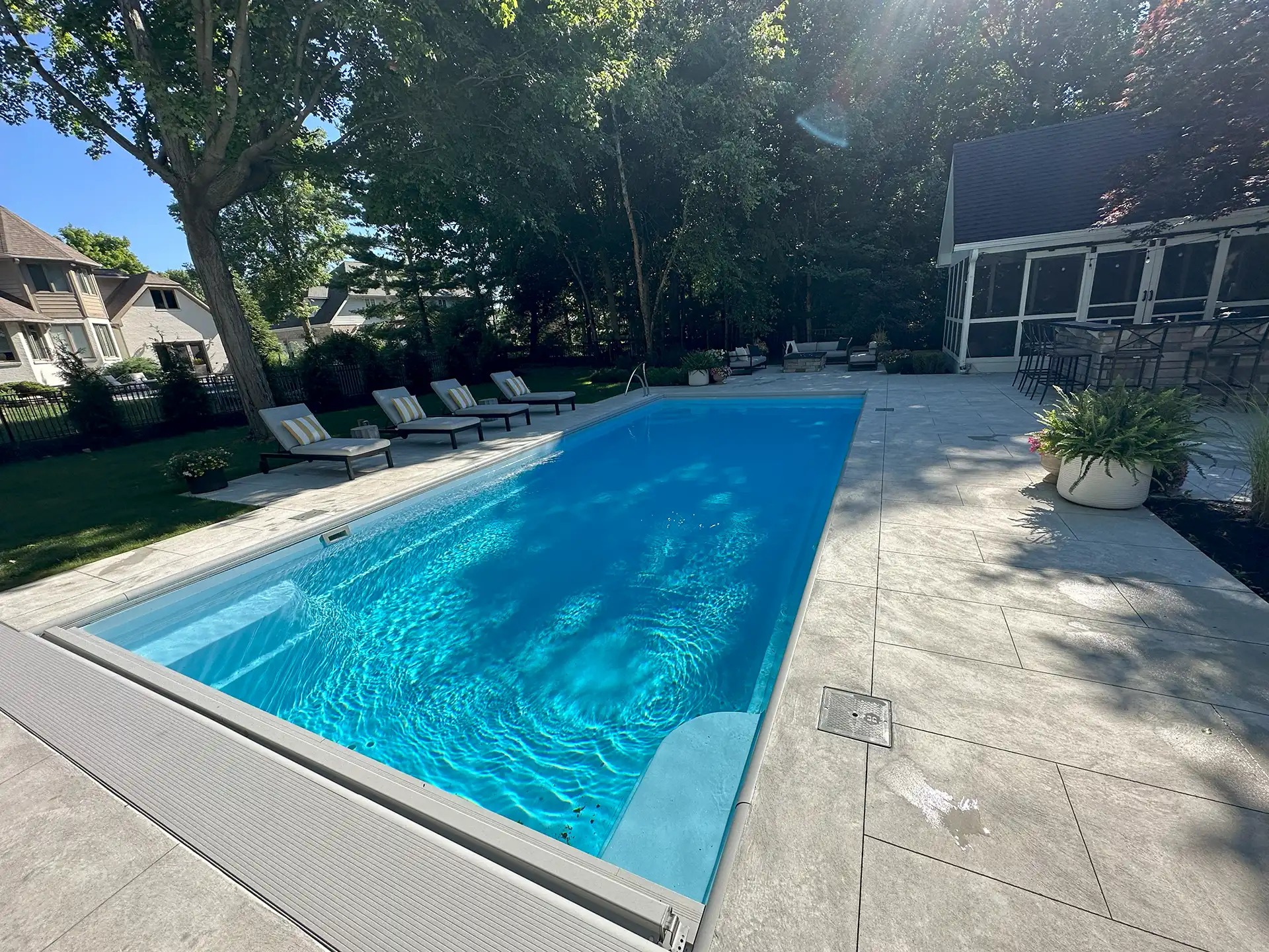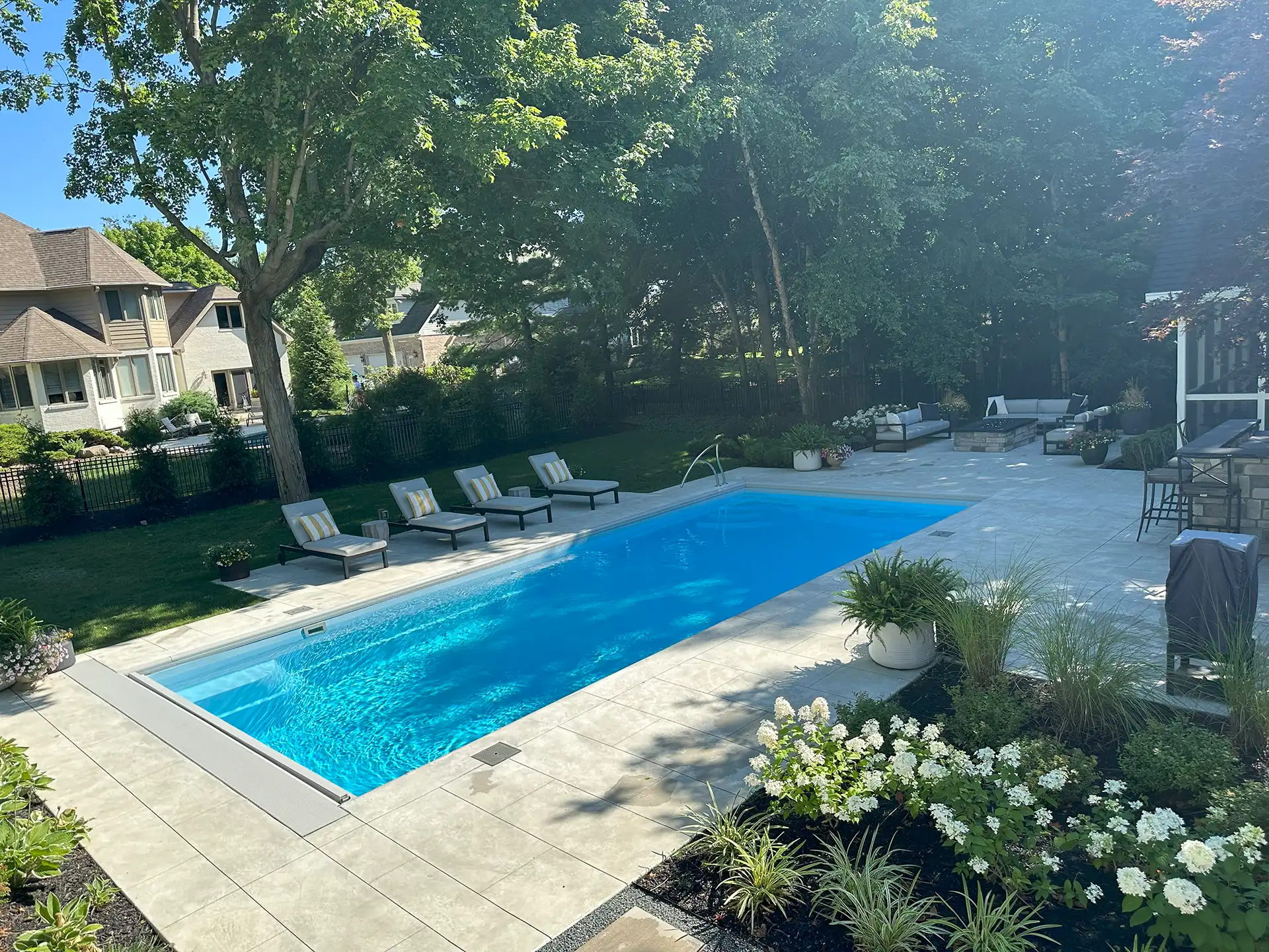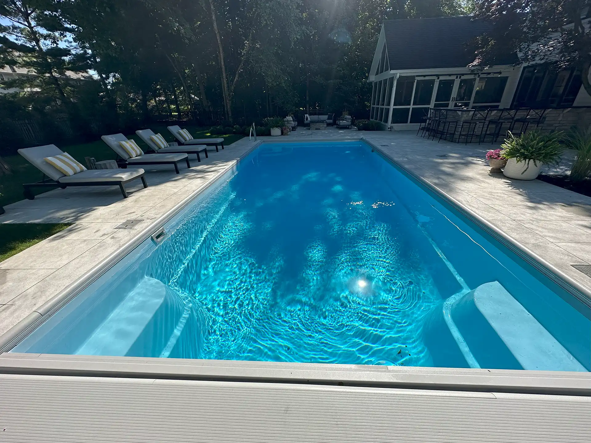 Peaceful custom fiberglass pool featuring decorative rail, outdoor kitchen, and equipment screening., Seek zen in this serene fiberglass pool (R36 model in Caribbean). With decorative rail, undermount pool cover, outdoor kitchen, standard concrete, decorative cuts, equipment screening, and corner bench seats, it hides away stress for mindful moments in Indiana’s tranquility.