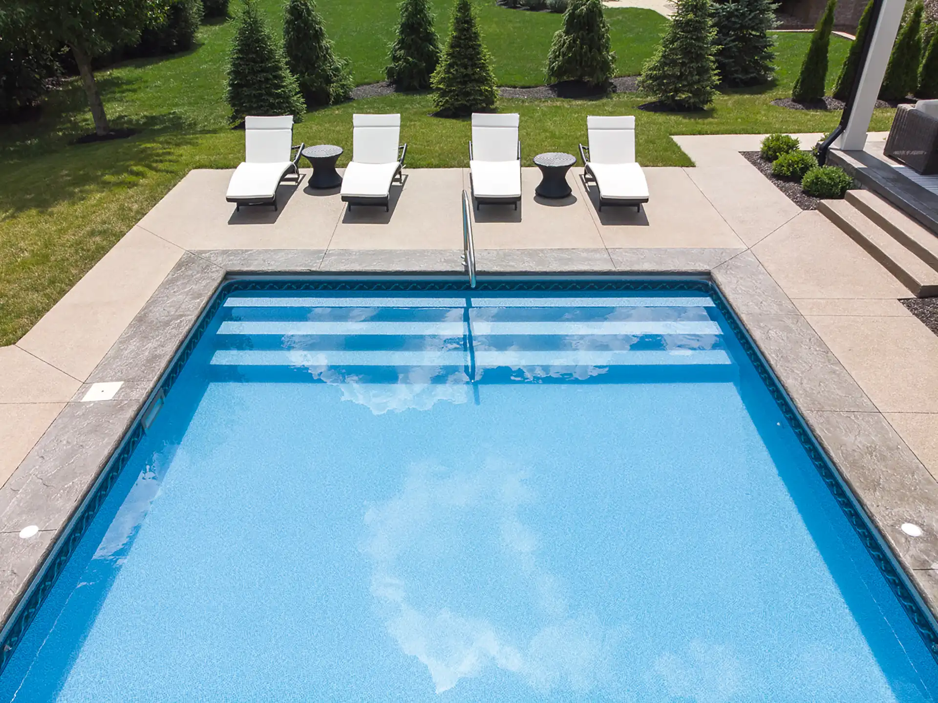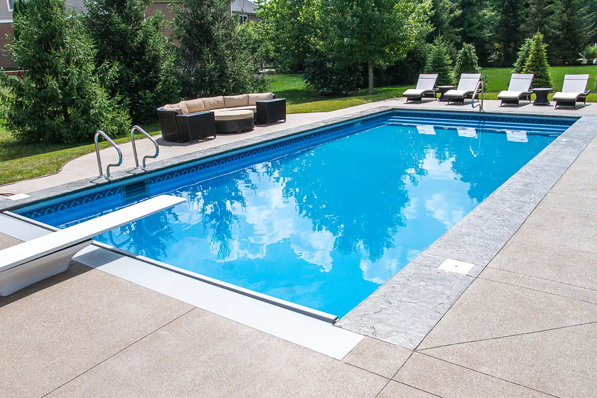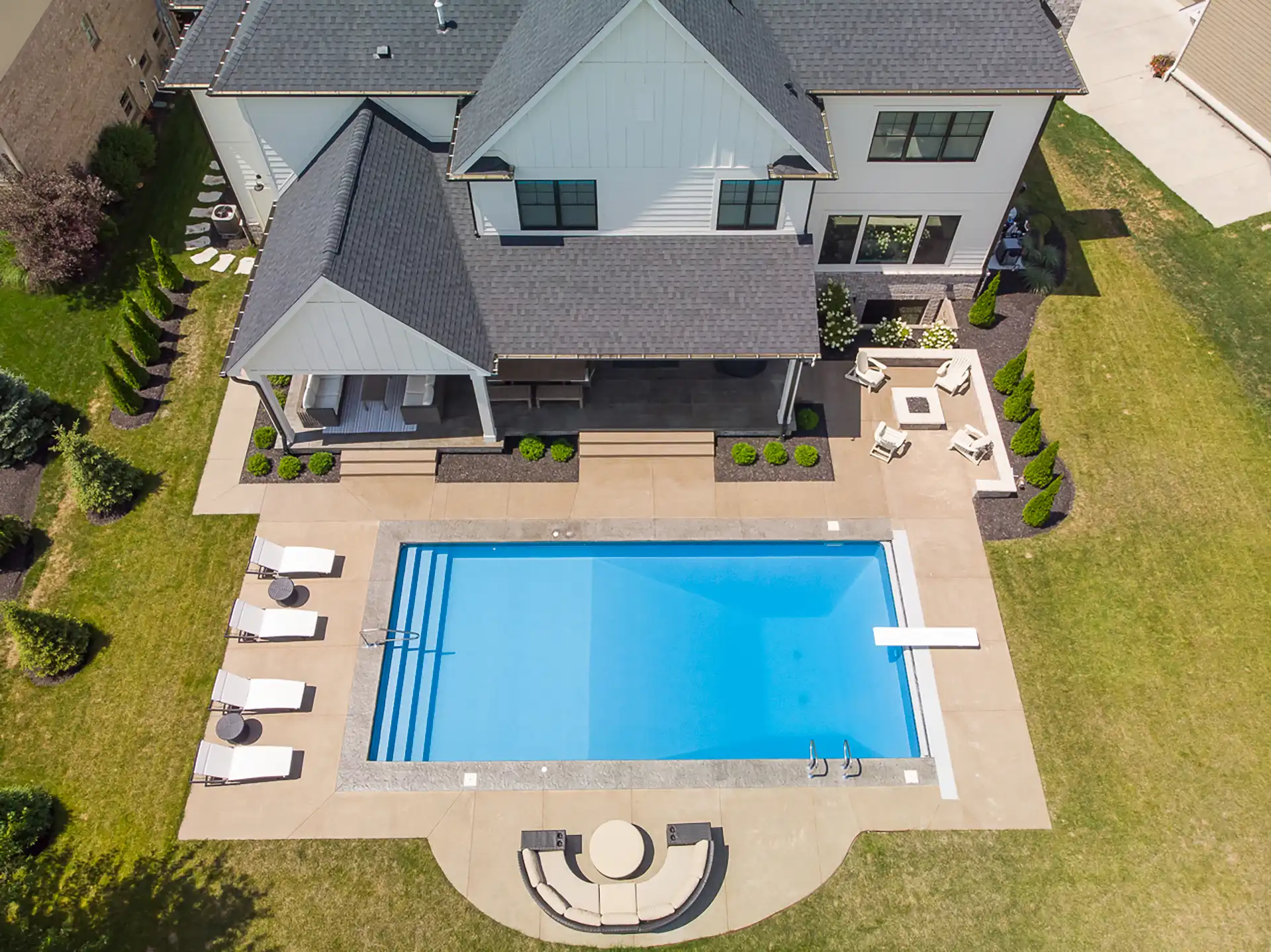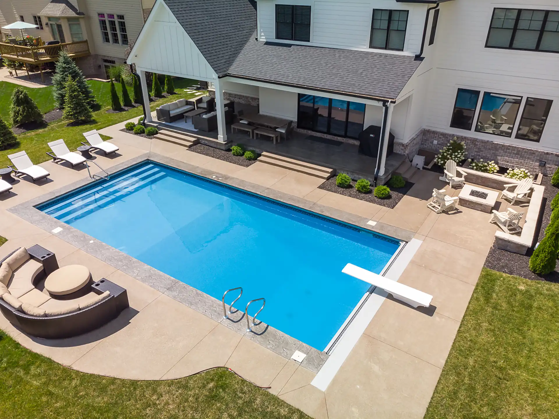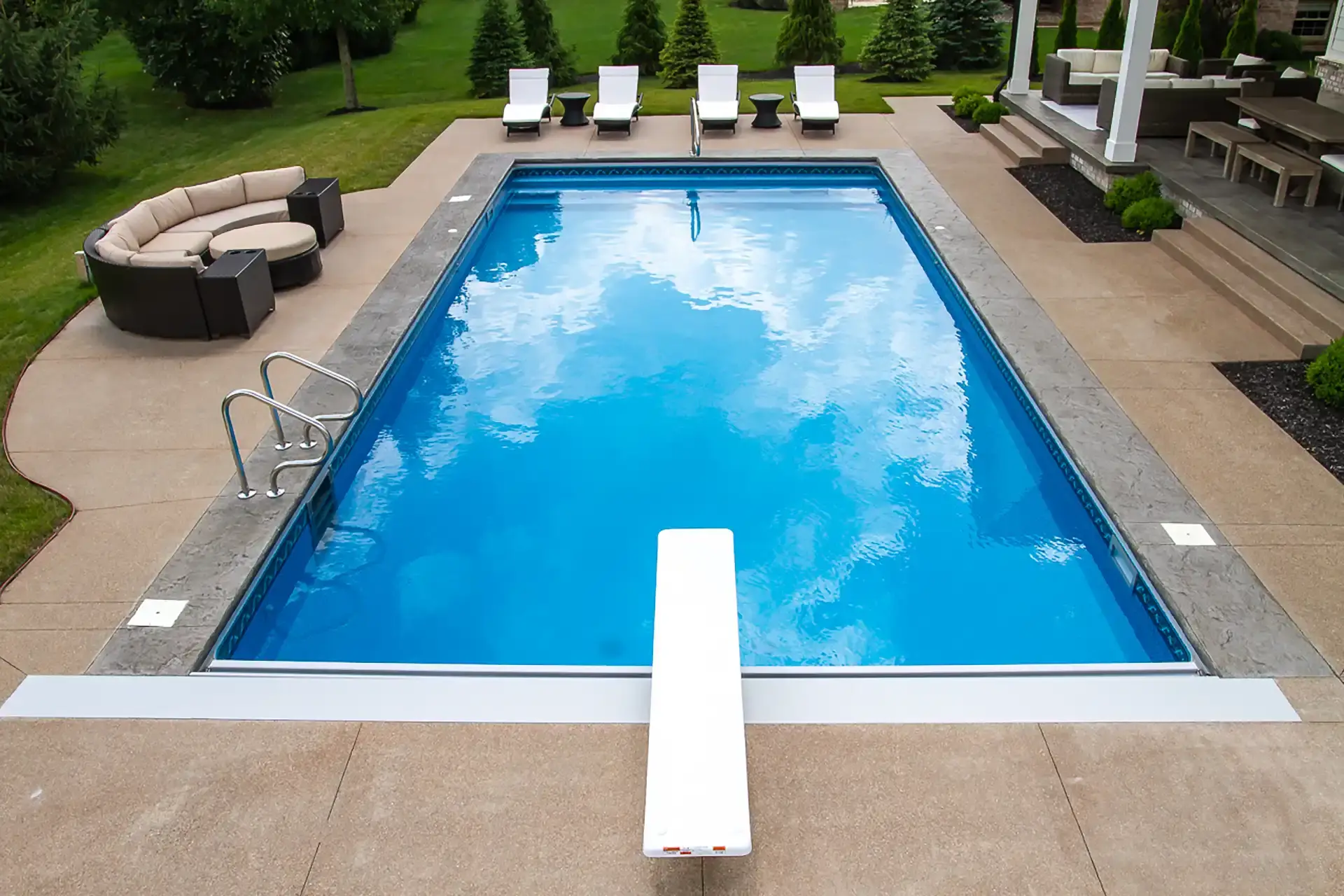 Refined 18×36 vinyl pool with full steps, diving board, stained border, and fire pit.