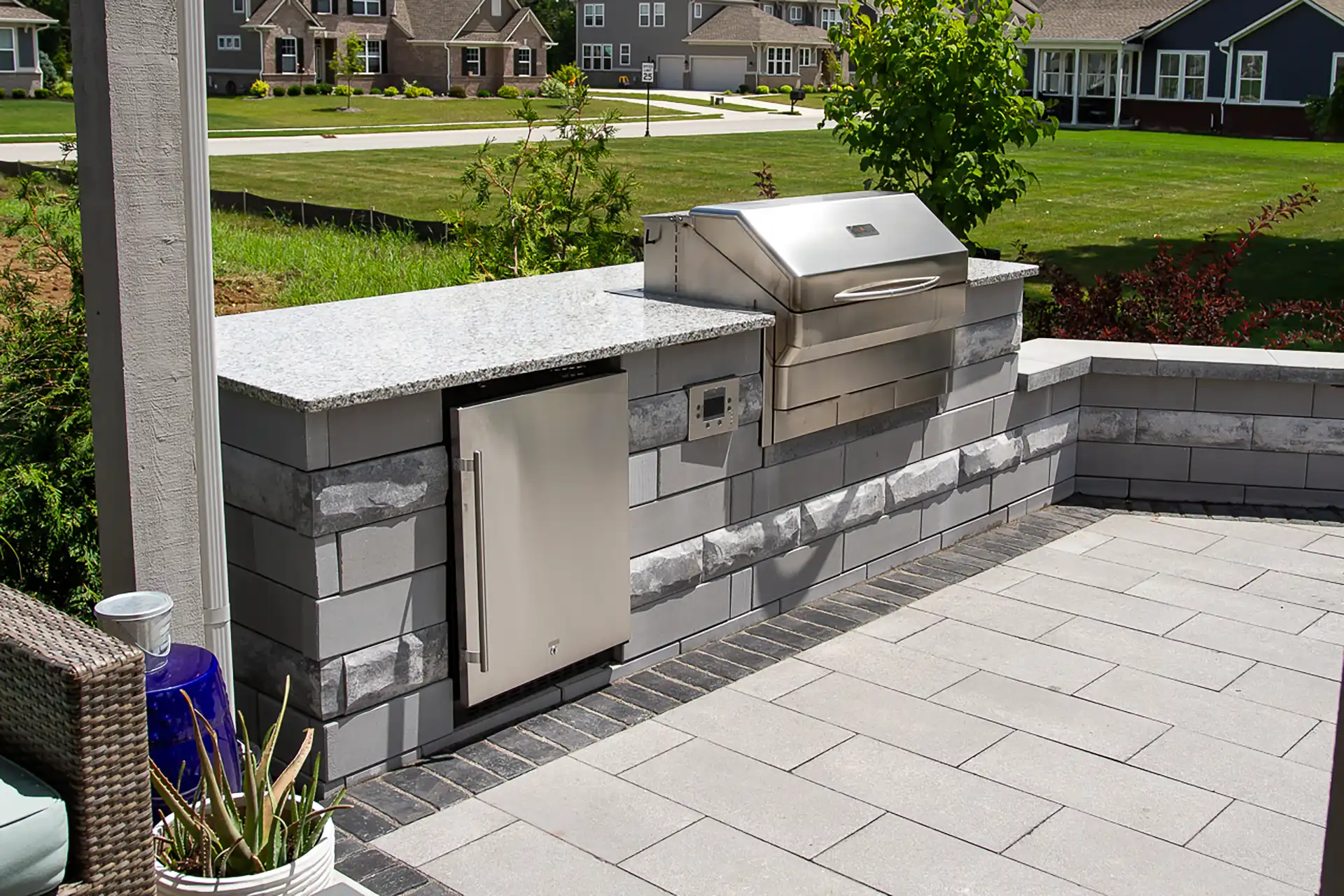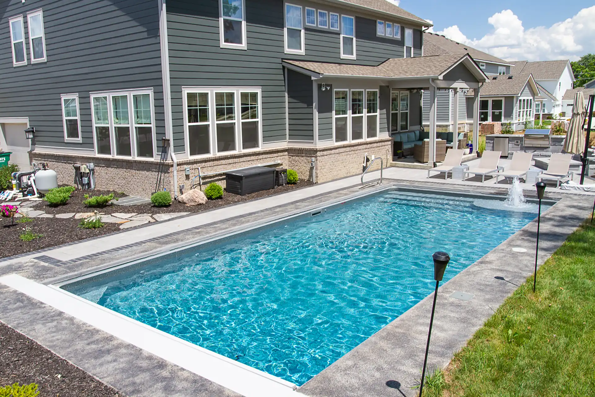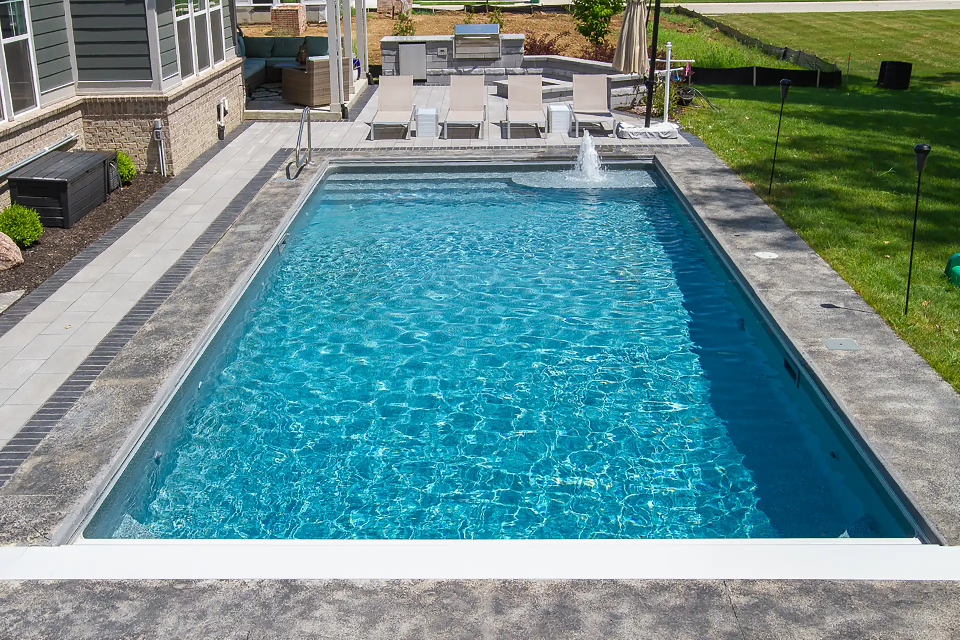 Lush 16×36 vinyl pool including tanning ledge, bubblers, outdoor kitchen, and stamped concrete.