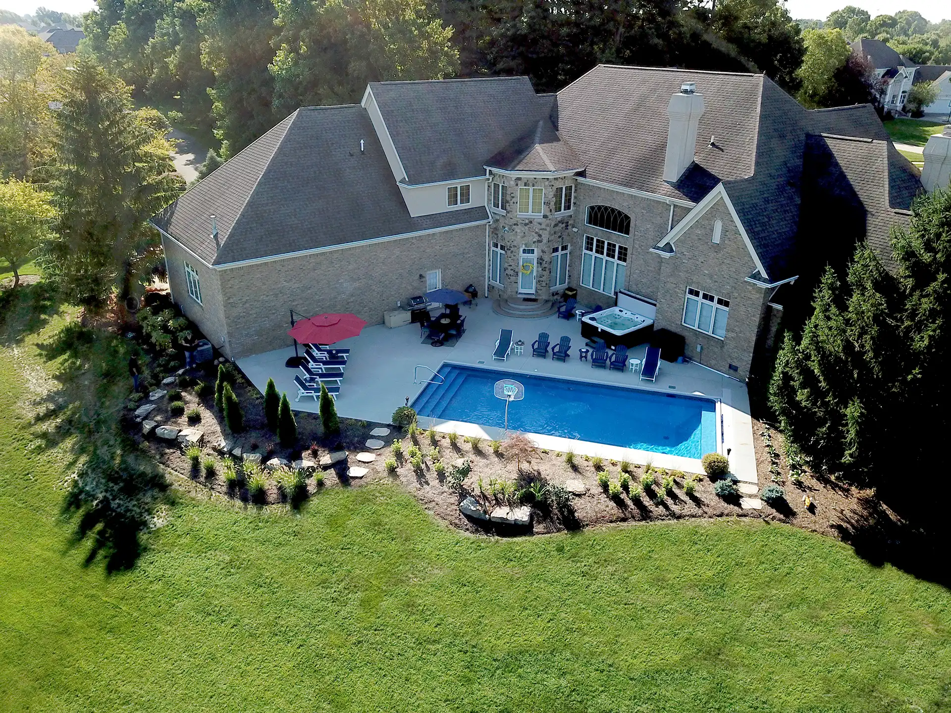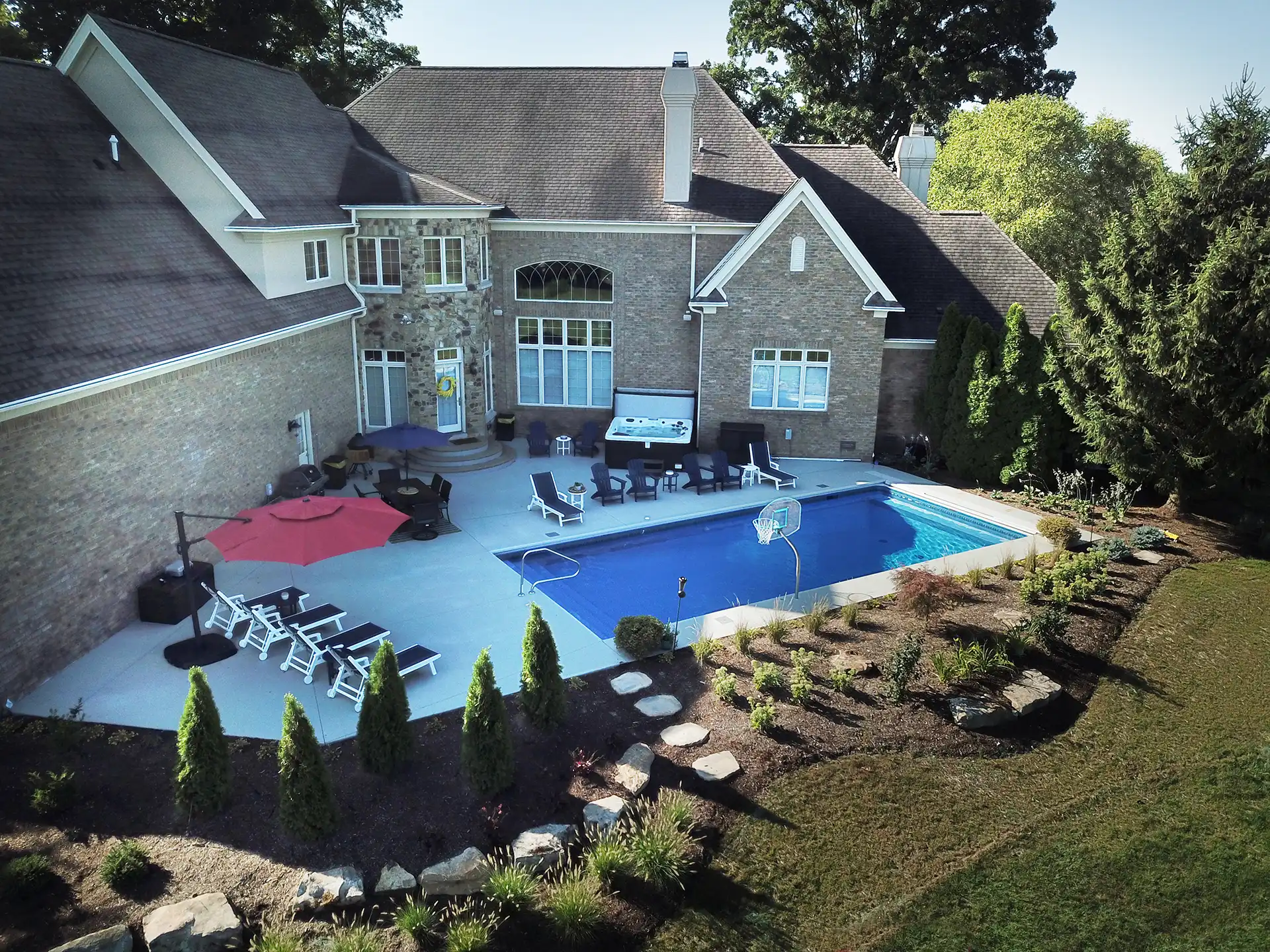 Pure 16×38 vinyl pool with full step, hot tub, basketball hoop, and boulder retaining.