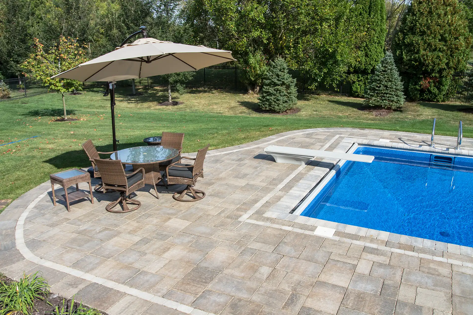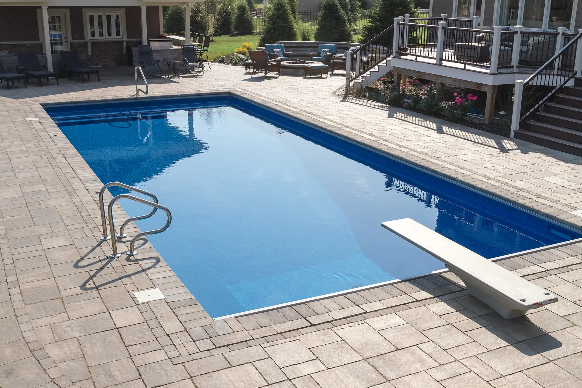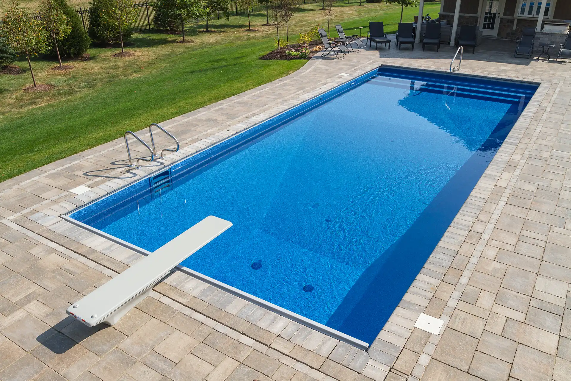 Playful 18×40 vinyl pool with paver coping, full steps, diving board, and pool house.