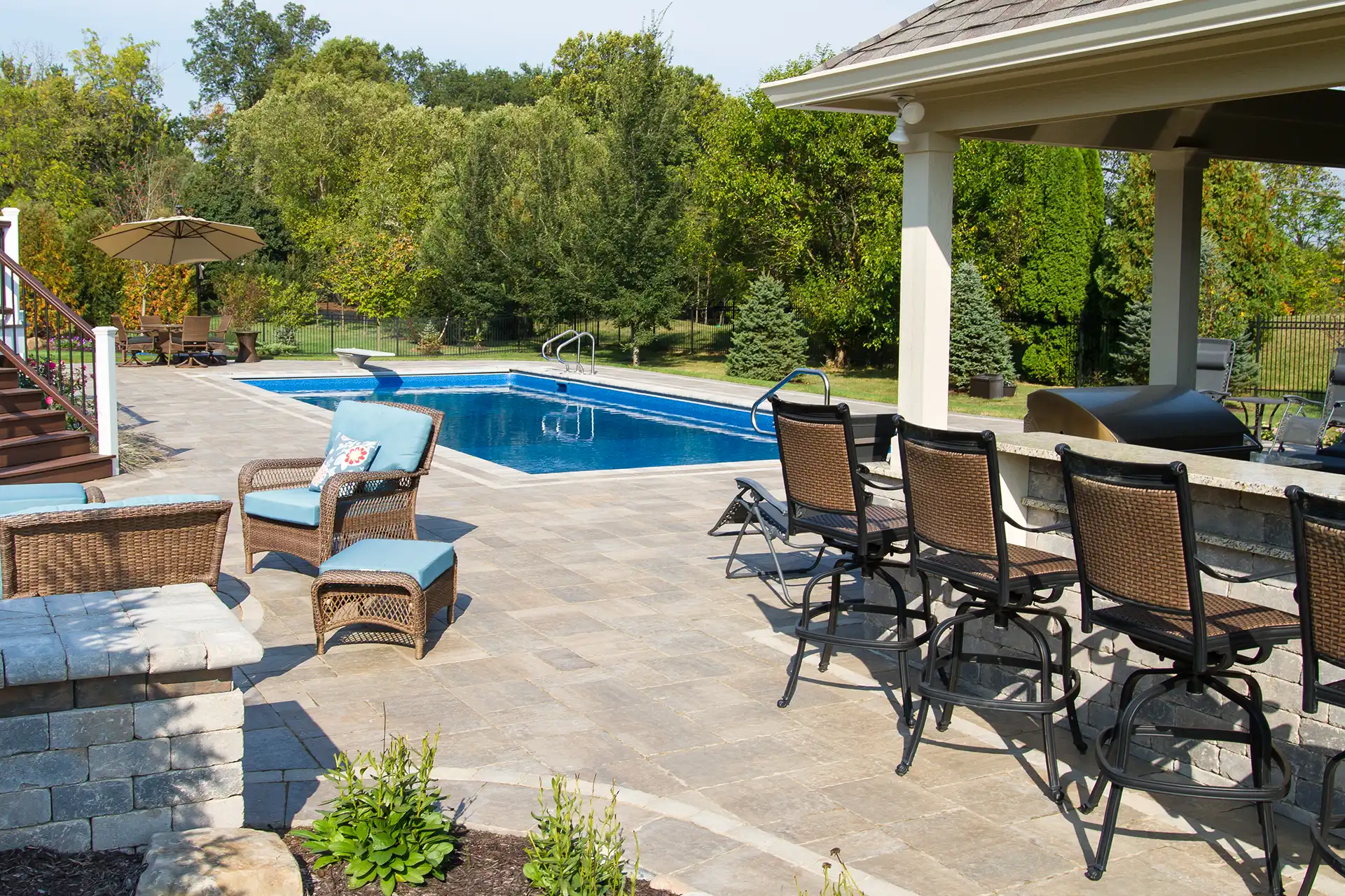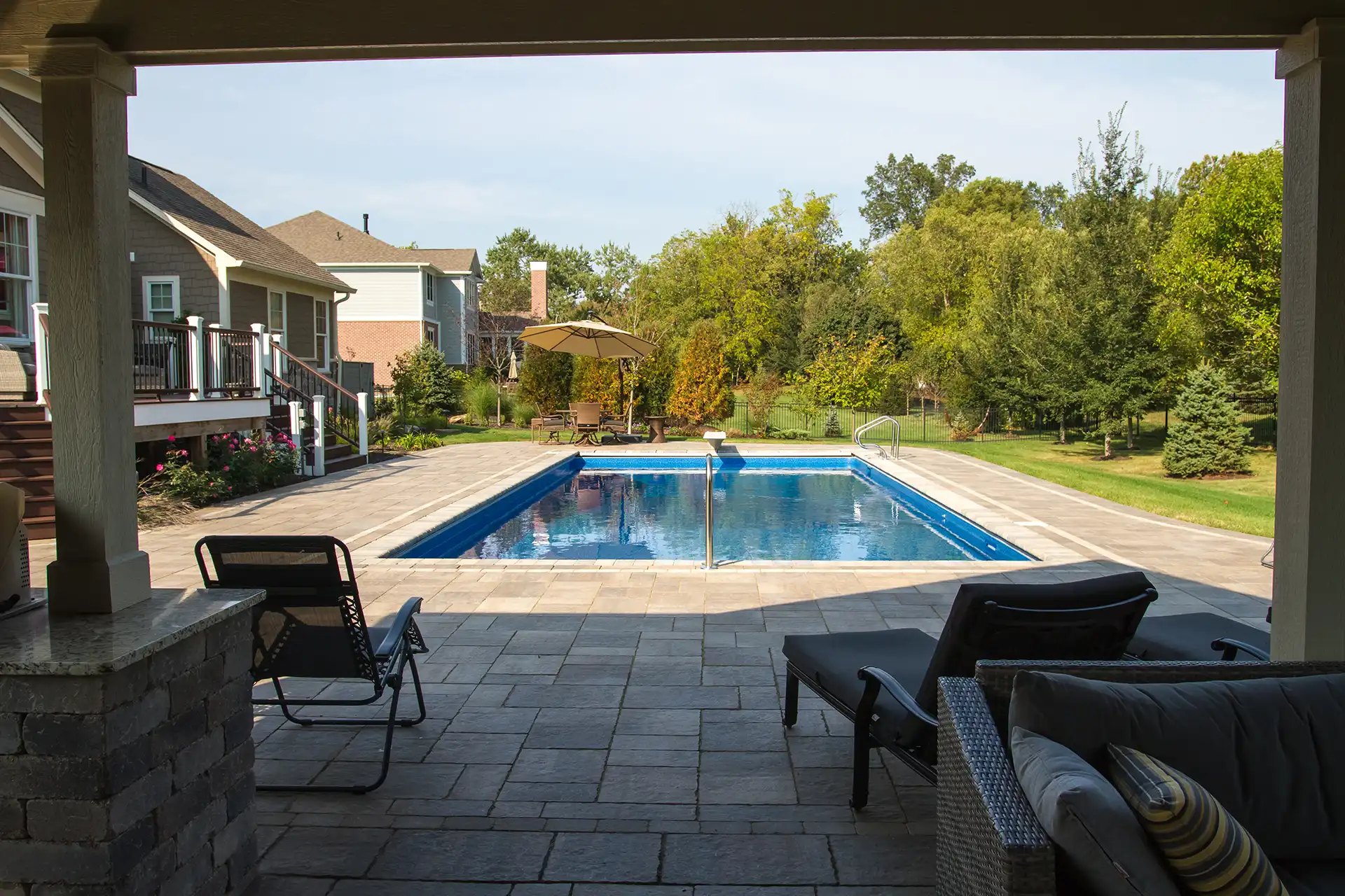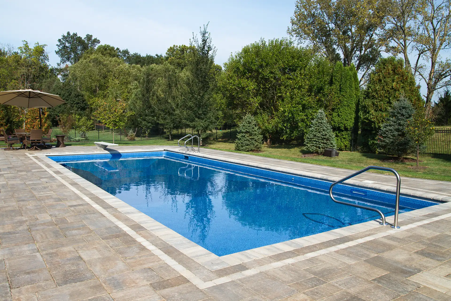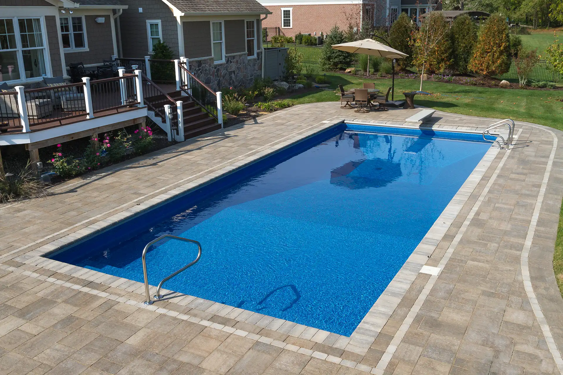 Playful 18×40 vinyl pool with paver coping, full steps, diving board, and pool house.