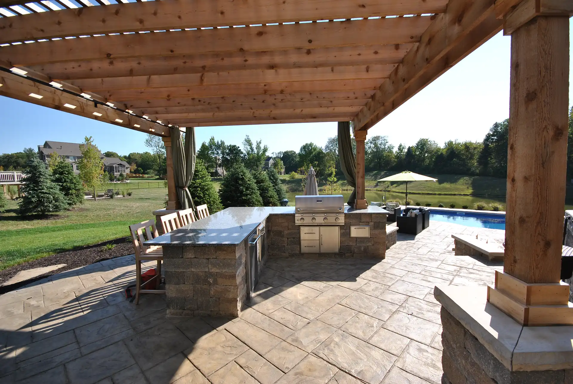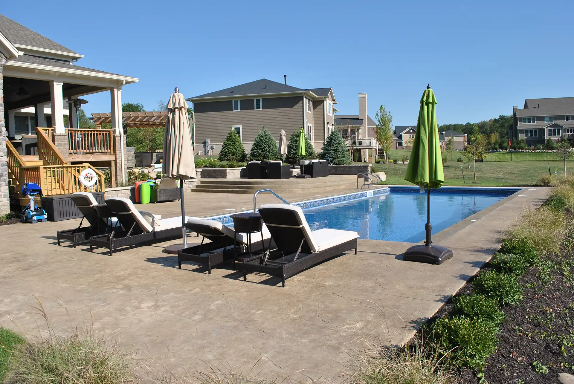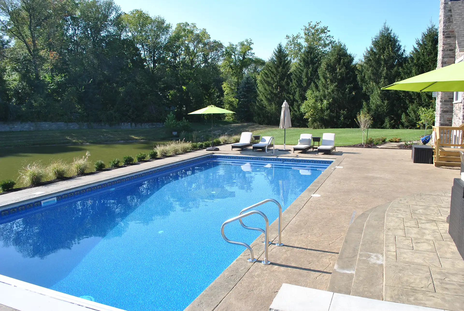 Enchanted 20×40 vinyl pool featuring full steps, stamped concrete, hot tub, and outdoor kitchen.