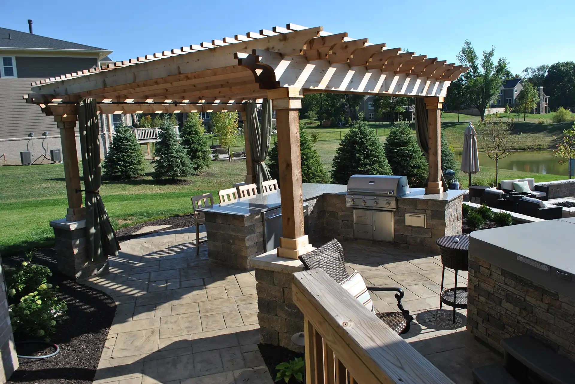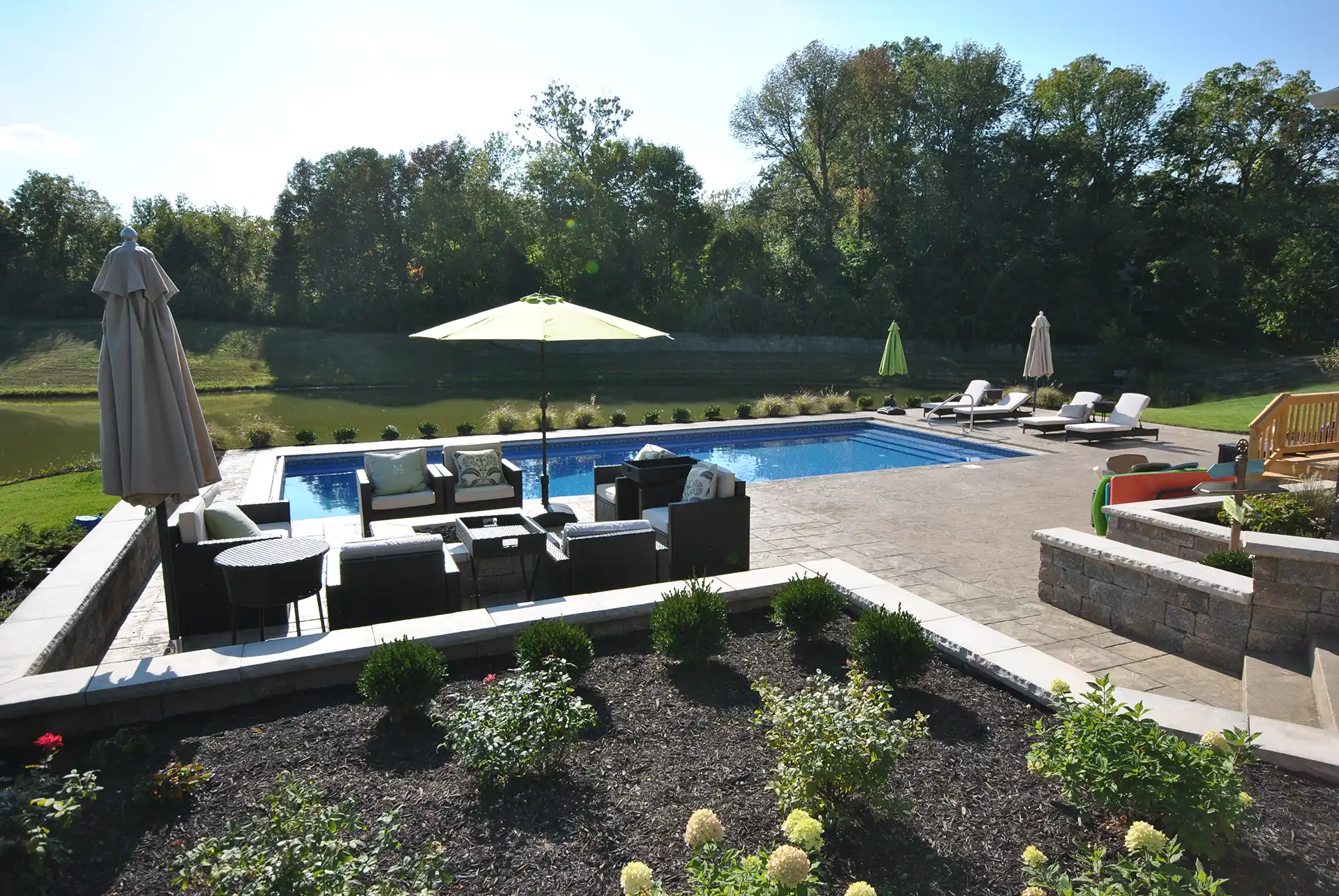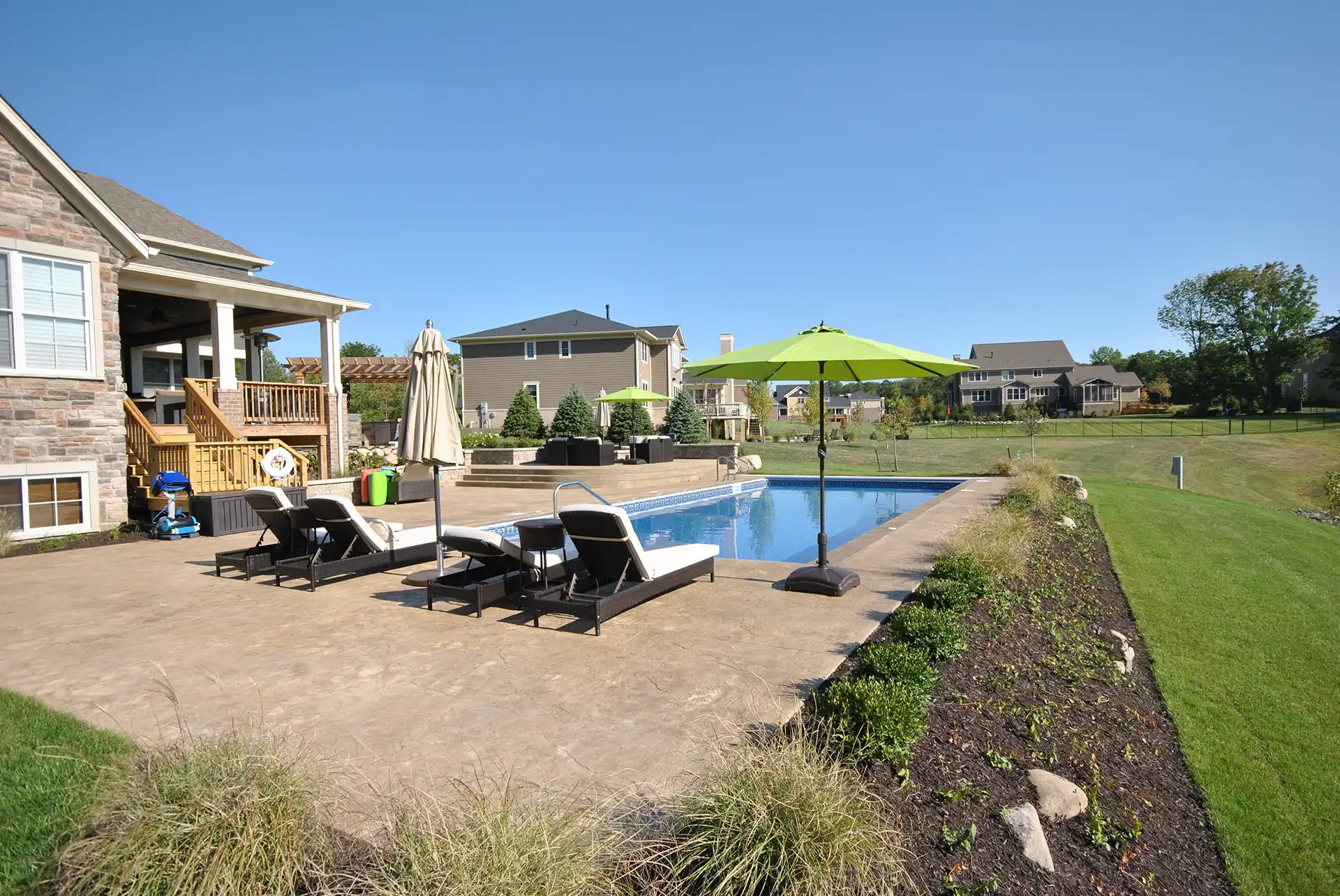 Enchanted 20×40 vinyl pool featuring full steps, stamped concrete, hot tub, and outdoor kitchen.