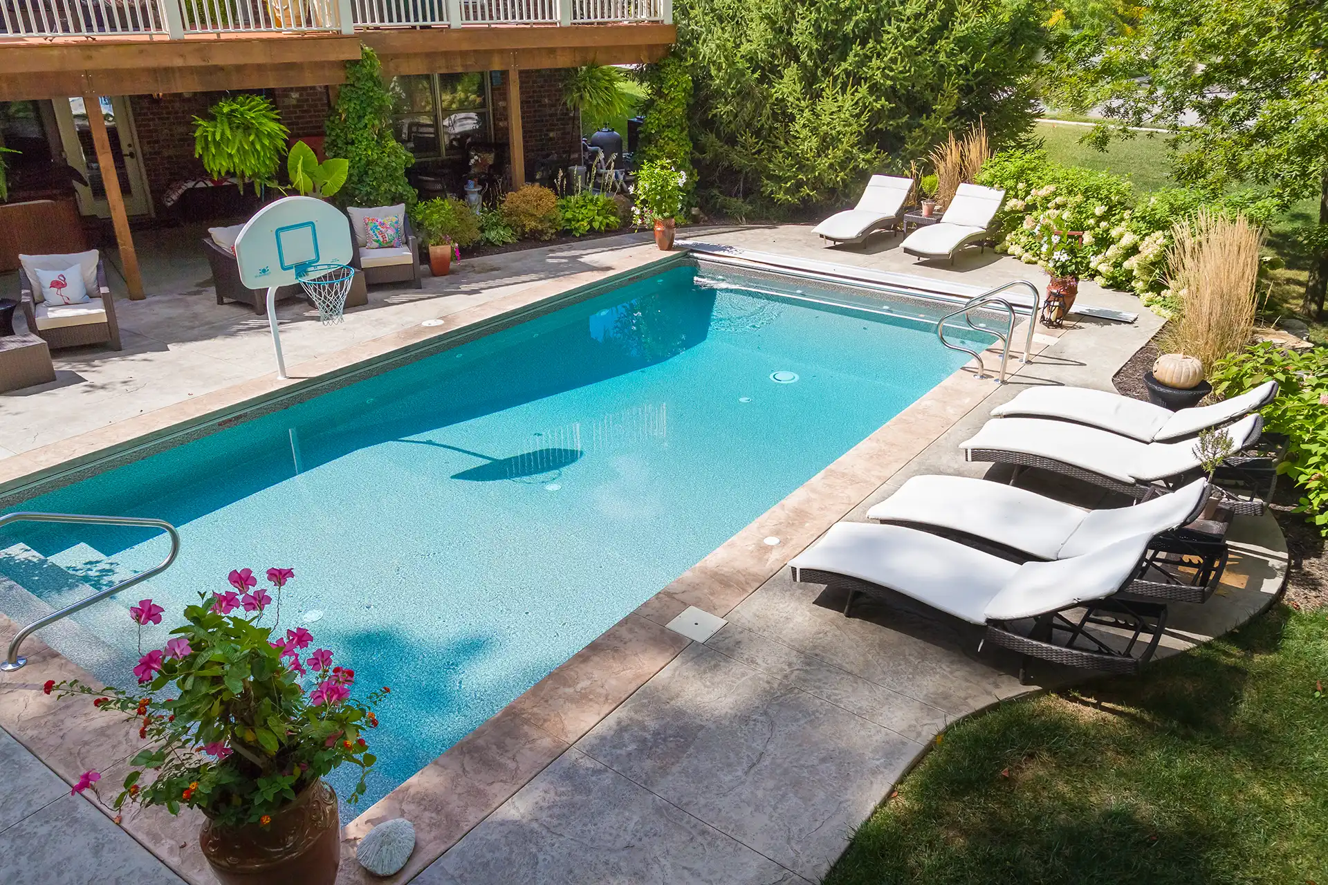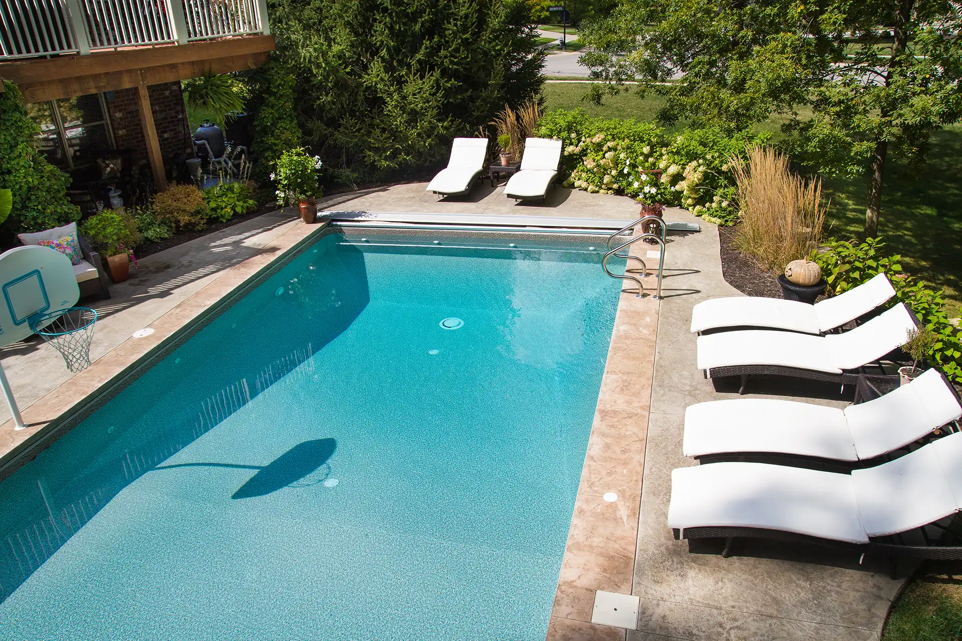 Mythic 16×32 fiberglass pool with tanning ledge, standard concrete, and decorative cuts., Zone into legend with this 16×35 fiberglass pool in coral blue (Illusion 35). Featuring tanning ledge, standard concrete, undermount automatic pool cover, and decorative concrete cuts. A mythic zone for legendary lounges in Indiana.